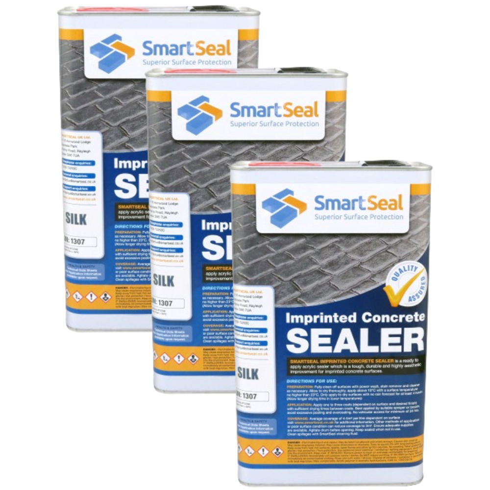 Revitalize your imprinted concrete driveway and patio with SmartSeal Silk Finish Imprinted Concrete Sealer. This three-in-one solution recolours, reseals, and protects, restoring faded stamped or pressed concrete to its former glory. Its non-yellowing formula resists water, alkalis, and acids, while a UV absorber minimizes colour loss. Enjoy a stunning silk finish that enhances the pattern and provides long-lasting protection against weathering, cracking, and damage from vehicle use. Keeps your surfaces algae, dirt, moss, and lichen-free. For best results, apply two coats at a coverage rate of 4.0-6.0 sq. meters per litre. This durable sealant extends the life of your outdoor concrete. 5L. Pack of three.