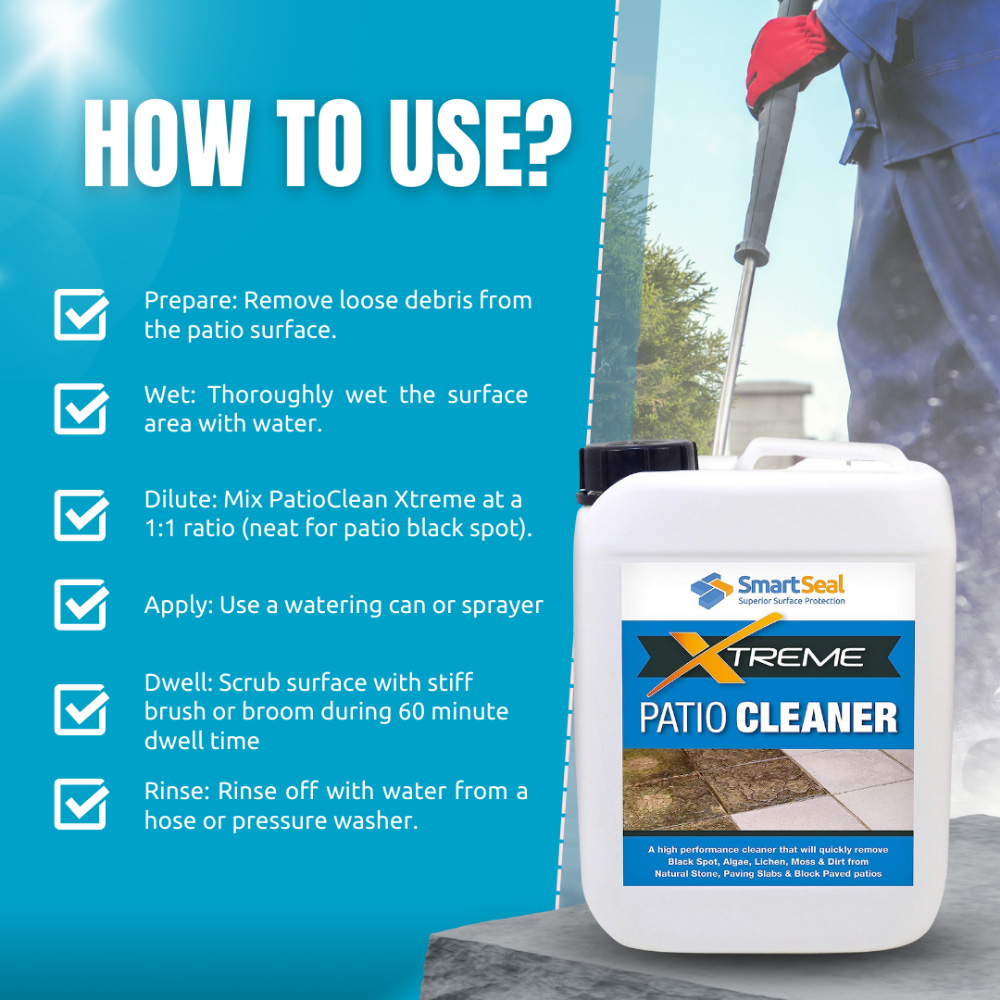 Uncover your patio's hidden beauty with SmartSeal Xtreme Patio Cleaner. This powerful cleaner tackles ingrained dirt and grime, eliminating the need for high-pressure washing. Its four active ingredients deliver fast-acting results. For most organic matter, a single application—applied with a sprayer or watering can—will suffice. However, stubborn black and white spot algae may require a second application. Remember to keep the surface wet during the 60-minute treatment time, the product becomes inactive when dry. Dilute at a 1:1 ratio (unless tackling black spot algae, in which case, use undiluted). A 5L diluted solution covers up to 40m². Before applying, sweep away loose debris. Then, wet the surface, apply the SmartSeal Xtreme Patio Cleaner, and ensure it remains wet for 60 minutes before rinsing thoroughly. This 25L container is your key to a sparkling clean patio.