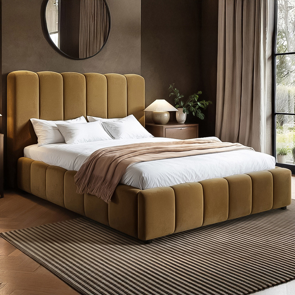 Elevate your bedroom with the Emilie Ribbed Ottoman Bed from Solace+Co. Available in plush velvet or textured boucle, this bed offers a touch of luxury and practical storage. The striking tall headboard features a unique scalloped design with bold vertical panelling. With a fully padded frame for enhanced comfort and safety, its earthy, neutral hues effortlessly complement any décor. The easy-lift ottoman base reveals ample hidden storage, perfect for maintaining a clutter-free bedroom.