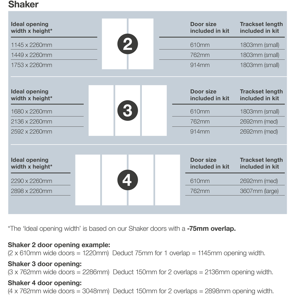 The Shaker range offers you the flexibility to create either a contemporary or more traditional look in either a mirror or panel combination. Two guides are attached to the top of the door and two wheels to the bottom which allows the door to slide along the track set. These doors fit an opening height of 2260mm.