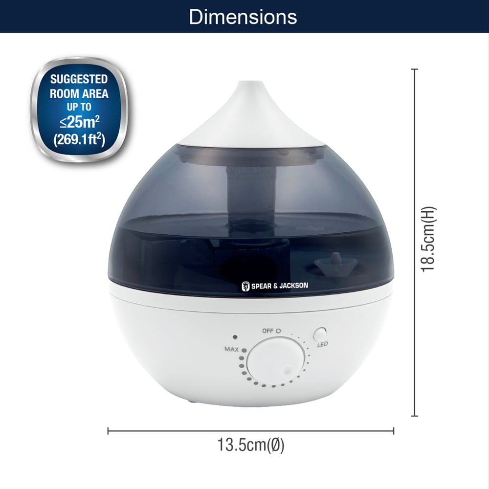 The Spear & Jackson Aroma Diffuser effectively adds moisture to the air, combating dryness and relieving cold or flu symptoms. Maintaining optimal humidity improves indoor air quality and comfort. This humidifier offers 18 mist output settings for customized control, from gentle nighttime operation to more intense humidification. The automatic shutoff conserves energy and prevents damage when the 1L water tank is empty. Despite its compact size (16.8 x 18.5 x 16.8cm), it effectively humidifies areas up to 25m². Its lightweight design ensures easy portability. Quiet operation (35db on low) promotes restful sleep. Enjoy the added benefit of aromatherapy, simply add essential oils to the fragrance drawer. An optional calming glow offers a soothing night light function.