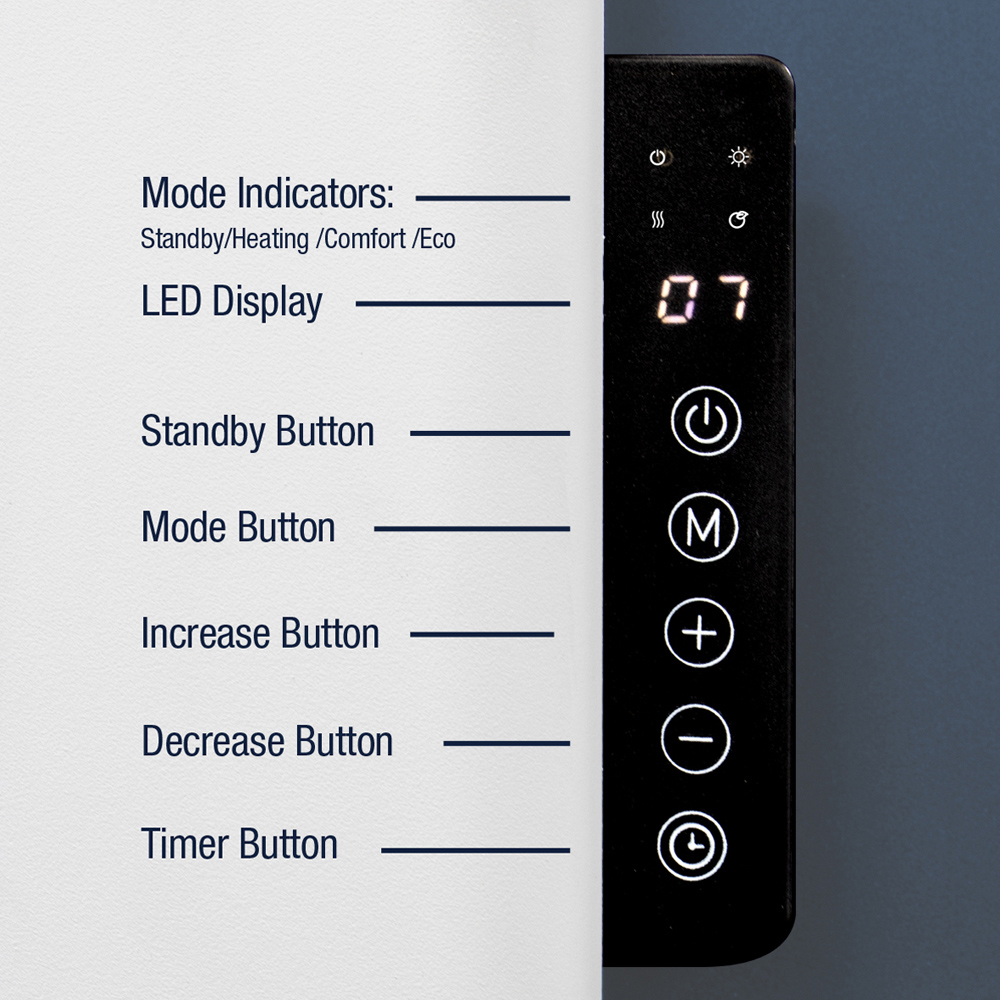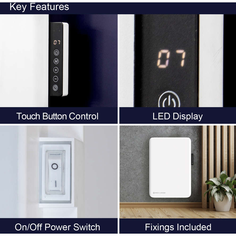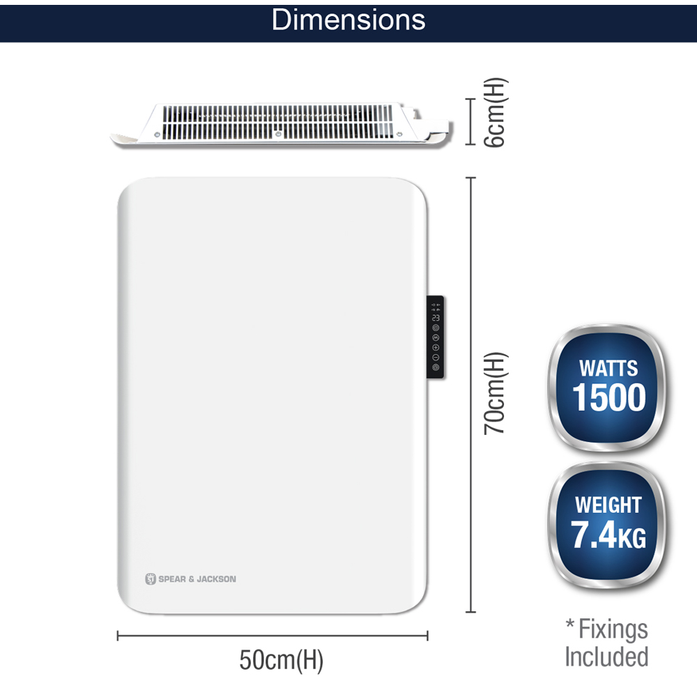 Upgrade your home heating with this sleek 1500W wall heater. Perfect for rooms up to 20m², it boasts a digital LED display for effortless control and reaches a maximum temperature of 35°C. Enjoy customizable comfort with automatic temperature adjustment and energy-saving eco mode, it also automatically shuts off if it detects open windows. Plus, its smart design includes overheat protection. Installation is a breeze with included brackets and clear instructions, detailing how to set a weekly program. A 24-hour timer adds extra convenience. The touch button controls and LED display ensure simple operation. Dimensions: 70 x 50 x 6cm. Fixings included.