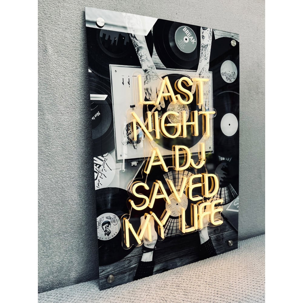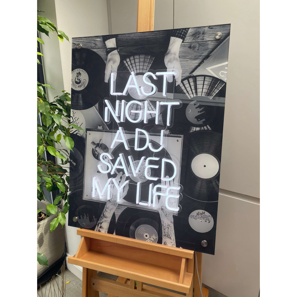 Brighten up your walls and show your love for music with the 'Last Night a DJ Saved My Life' LED Neon Wall Art. This radiant piece features a graffiti-style acrylic backdrop, illuminated by glowing LEDs, to bring a modern touch to any space. Ideal for any room or office, and perfect as a thoughtful gift, this unframed neon sign is simple to hang with pre-drilled holes and included fixings. With energy-efficient LEDs, this artwork offers an eco-friendly glow, ensuring a lasting and meaningful addition to your décor.