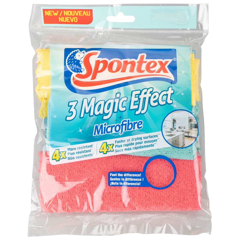 Clean, dry, and sparkling surfaces are just a wipe away with Spontex Magic Effect microfibre cloths. Their superior microfibre construction delivers four times the wear resistance* and four times faster drying** than our standard cloths. A special coating keeps them flexible, even when dry, eliminating stiffness. These cloths are highly efficient, needing only water for optimal cleaning, use damp for deep cleaning or dry for a brilliant shine. Conveniently featuring a corner hole for easy hanging, each cloth measures 24.5 x 25 cm and is made from 85% polyester and 15% polyamide. Assorted colours are included in each mixed pack. *Based on internal tests, compared to Spontex 4 Microfibre Cloths. **Based on internal tests, compared to Spontex Microfibre Window Cloth.
