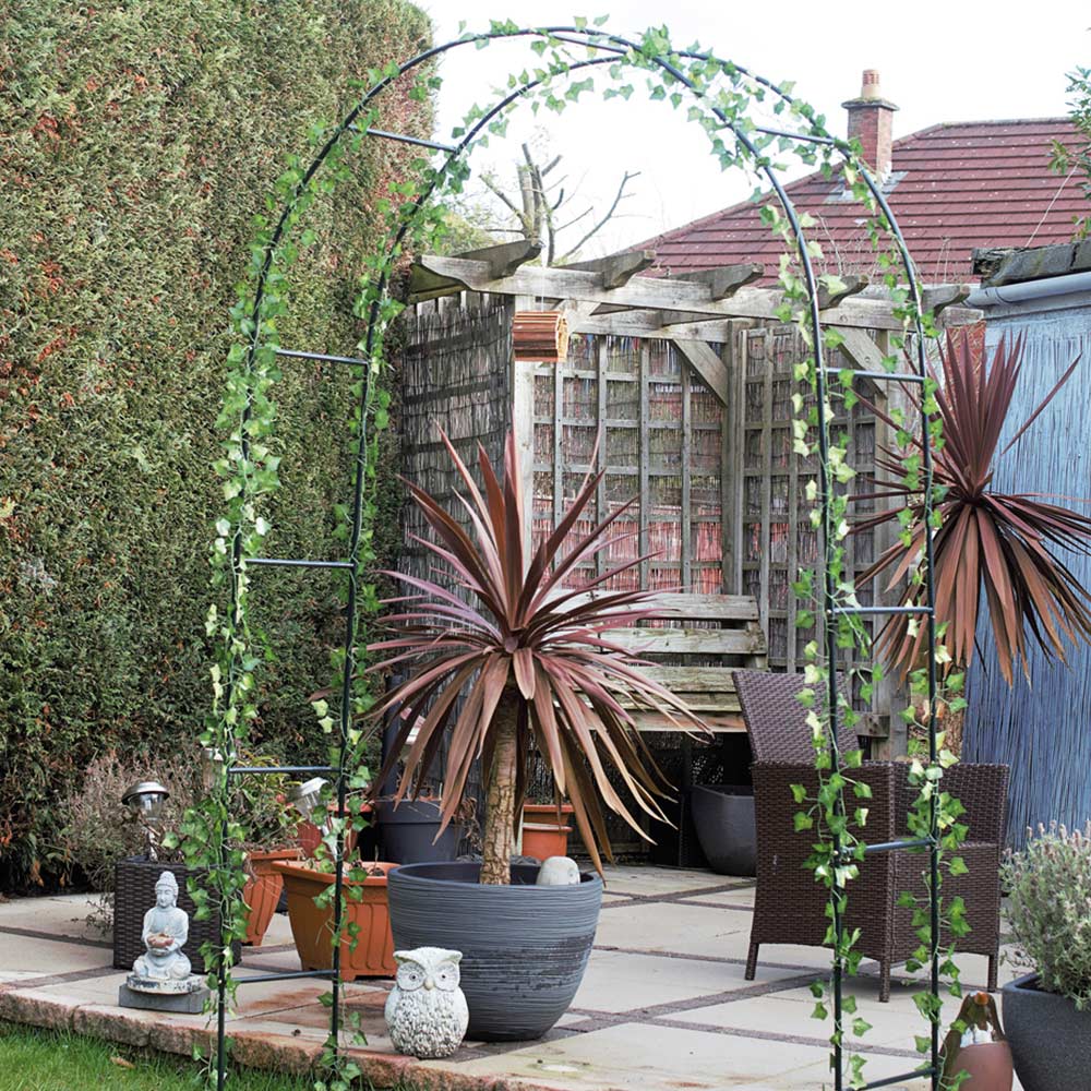 Add elegance and charm to your garden with the St Helens Decorative Garden Arch. Perfect for showcasing climbing plants, vines, and flowers, this versatile arch also creates a beautiful backdrop for hanging lights, enhancing your garden',s ambiance at night. Quick and easy to install – simply push the bottom 40cm into the ground. The powder-coated green finish ensures lasting durability and weather resistance, allowing you to enjoy its beauty for years to come.