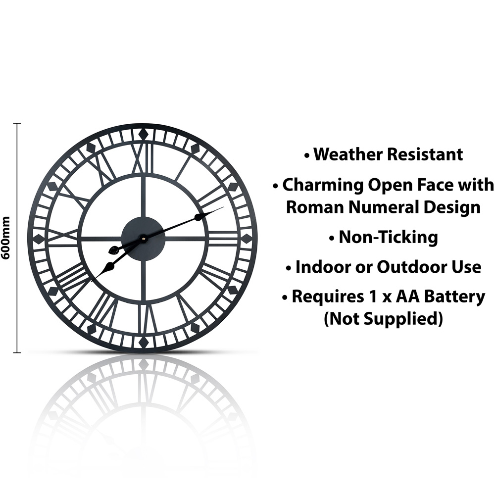 The St Helens Black Open Face Design Non-Ticking Wall Clock: a beautiful addition to any home or garden. This elegant clock boasts an open-face design with Roman numerals, adding timeless style to your décor. Made from durable, weather-resistant metal, it',s perfect for both indoor and outdoor use. The non-ticking mechanism ensures a peaceful atmosphere, while the pre-fitted hanging bracket makes installation quick and easy on walls, fences, summer houses, conservatories, or sheds. Requires one AA battery (not included). Diameter: 60cm.