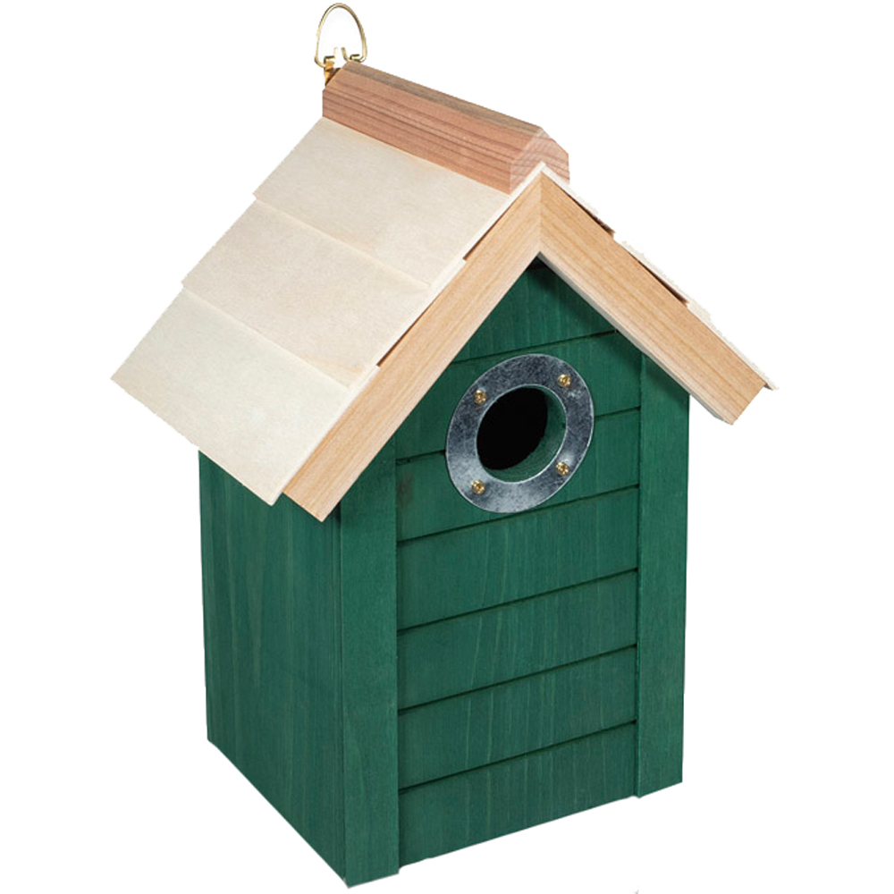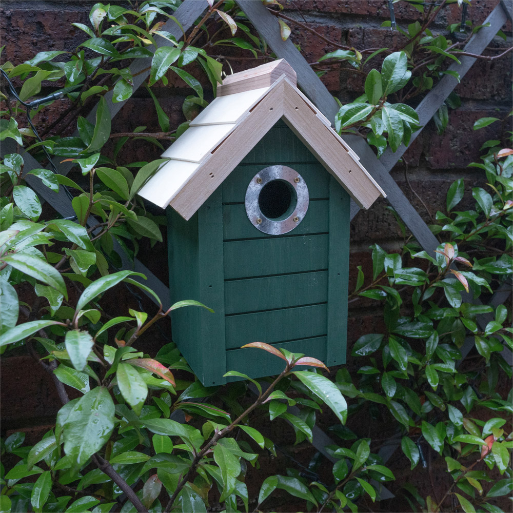 The St Helens Green Wooden Bird House provides a safe and welcoming home for your garden birds. Designed with a 30mm entrance hole, it',s perfectly sized for blue tits, coal tits, marsh tits, great tits, tree sparrows, and a host of other species. Simply attach it to a wall using the hanging point on the back.