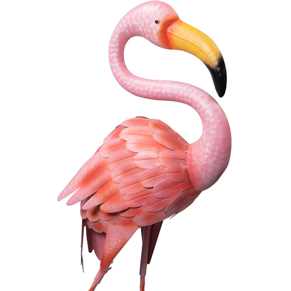 This cheerful pink metal flamingo will add a vibrant splash of colour to your garden, pond, or even your indoor space. Perfect for themed parties or simply adding a touch of whimsy to your home, this eye-catching ornament is easily secured using U-shaped pegs (not included). Made from sturdy metal, it',s built to withstand all types of weather and will bring joy for years to come. At 89cm tall, it makes a delightful statement piece.