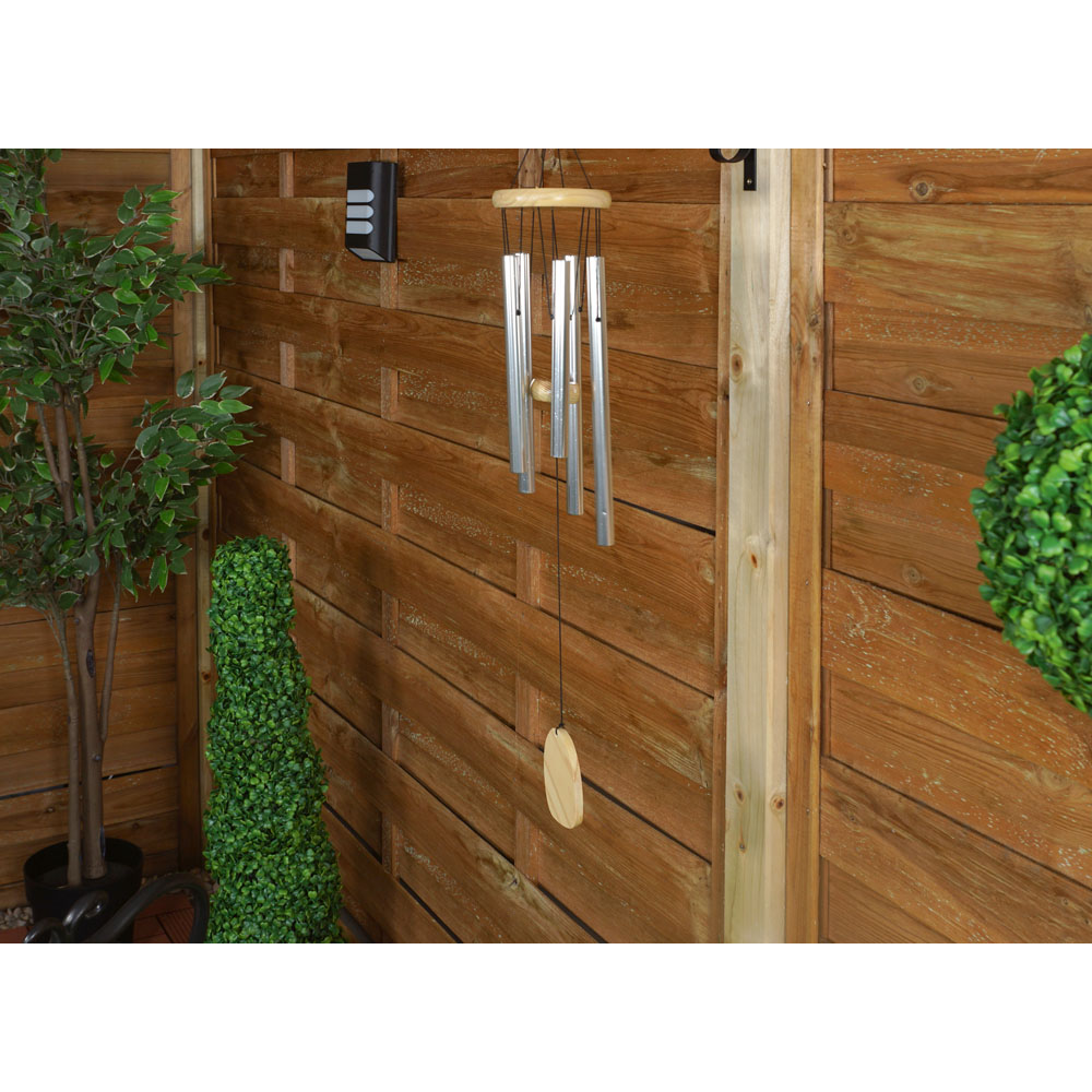 Bring tranquility to your garden with the St. Helens Wind Chime. Hand-tuned aluminium tubes of varying lengths create a deep, soothing melody when the wind catches the bottom wind catcher. This centuries-old symbol of good fortune is believed to ward off negativity. The natural wooden top disc, bell, and wind catcher beautifully complement the silver aluminium tubes. Measuring 77cm from the hook to the wind catcher, it easily hangs from trees, lights, or brackets.
