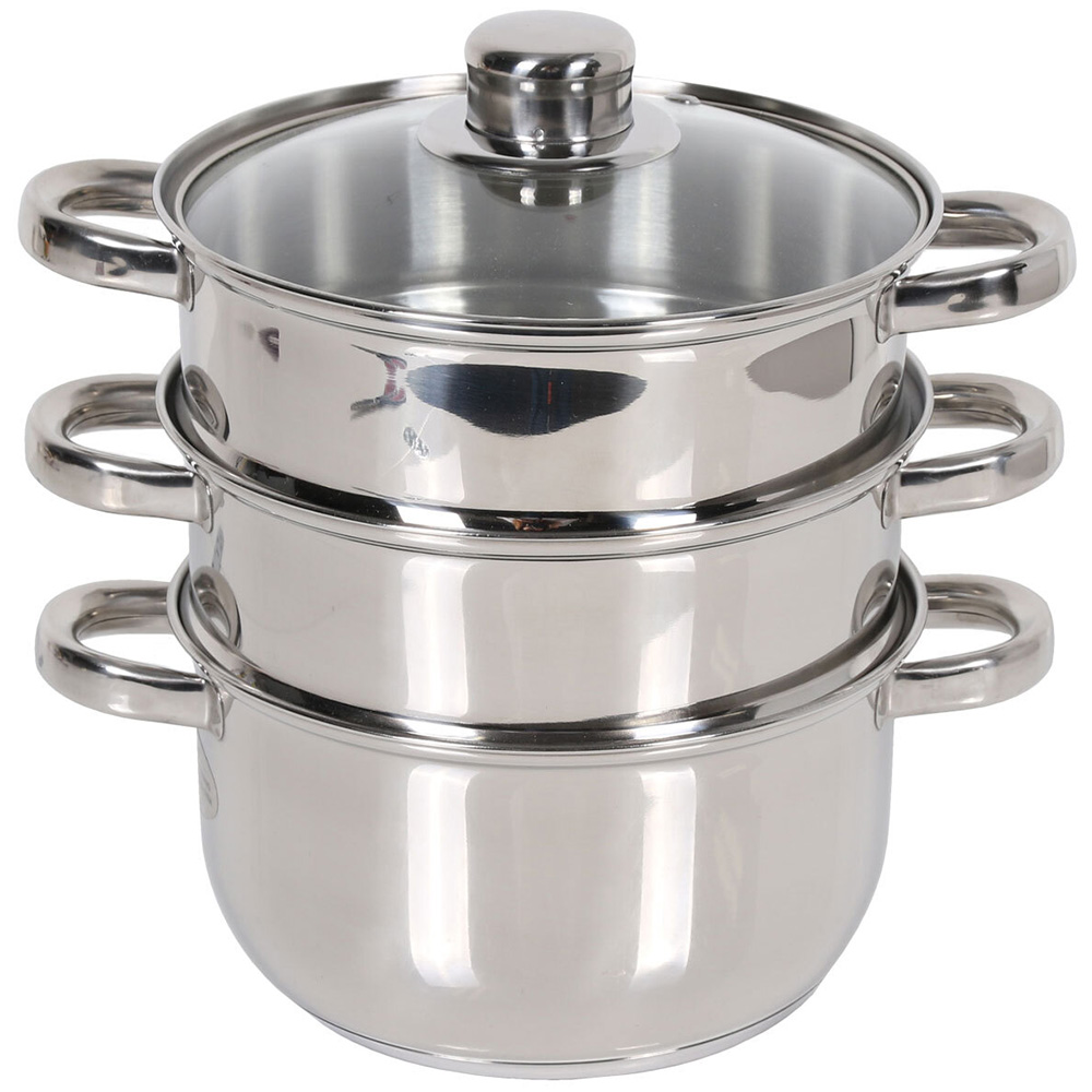 Effortlessly prepare healthy, home-cooked meals with this stylish three-tier stainless steel steamer. Perfect for steaming vegetables, fish, and more, it's compatible with all hob types. The tempered glass lid allows for easy monitoring, and the steamer base doubles as a versatile stockpot.