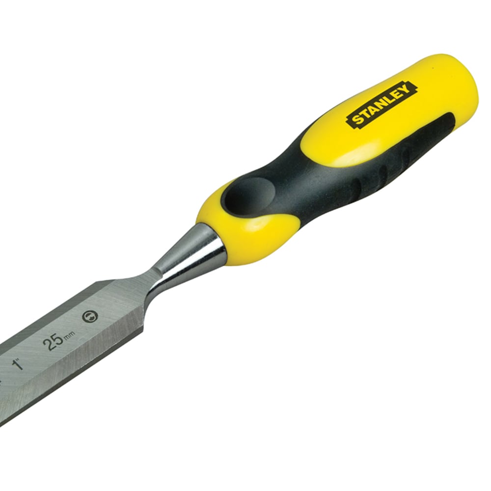This 25mm Stanley DynaGrip bevel edge wood chisel boasts a robust design for demanding woodworking tasks. Its forged high-carbon steel blade ensures exceptional strength and durability, while the steel striking cap allows for powerful blows with a hammer. The extended soft-grip handle provides enhanced comfort and control, making for precise and fatigue-free use. Ready to tackle your projects straight from the box.