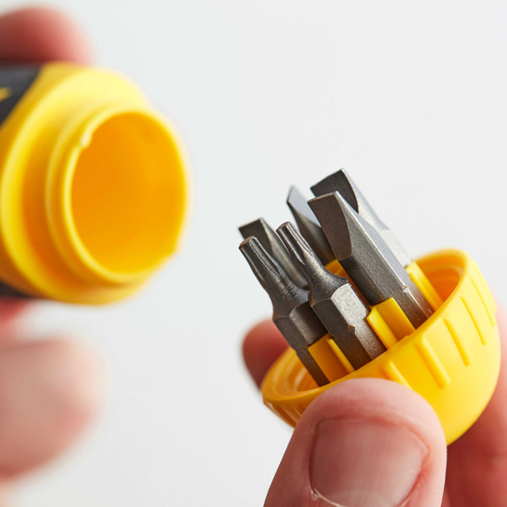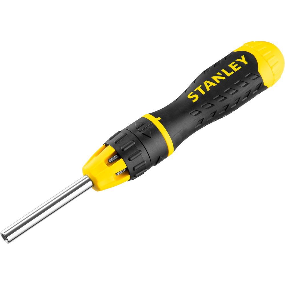 This Stanley multi-bit ratchet screwdriver boasts a robust design, featuring a spring-loaded, ball-bearing indexing mechanism for effortless bit changes. Its clever storage solution includes an integral magazine holding six bits, plus a handy holder containing a further four – providing a total of ten bits for diverse applications. The comprehensive bit selection comprises three 25mm Phillips, three 25mm Pozidriv, two 25mm slotted (3mm and 6mm), and two 25mm Torx bits.
