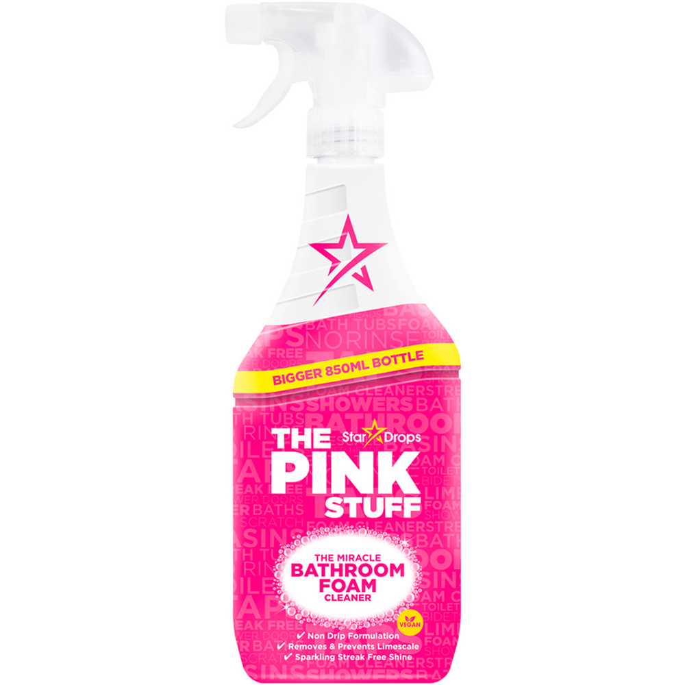 Unleash sparkling bathroom brilliance with Star Drops The Pink Stuff Miracle Bathroom Foam Cleaner. This non-drip foam clings to surfaces, tackling dirt, grease, and grime with ease. Banish limescale and achieve a streak-free shine. A plant-based formula, safe for septic systems and vegans, and never tested on animals. 850ml of powerful cleaning power. Suitable for hard surfaces. Spray directly onto surfaces, let it work its magic, and wipe away with a soft cloth. For best results, test in an inconspicuous area first. Avoid waxed, oiled, open-pore, painted, or varnished wood surfaces.