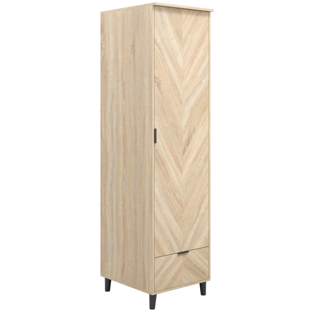 The Stockholm Chevron Single Door Single Drawer Sonoma Oak Wardrobe: a stylish and practical storage solution. Perfect for smaller rooms or as a statement piece, its compact design doesn',t compromise on functionality. The striking Sonoma Oak chevron pattern and integrated handles lend a contemporary feel, complemented by subtly contrasting matte black legs. A single drawer provides extra storage, enhancing both its aesthetic appeal and practicality. An ideal addition to any bedroom or dressing area.
