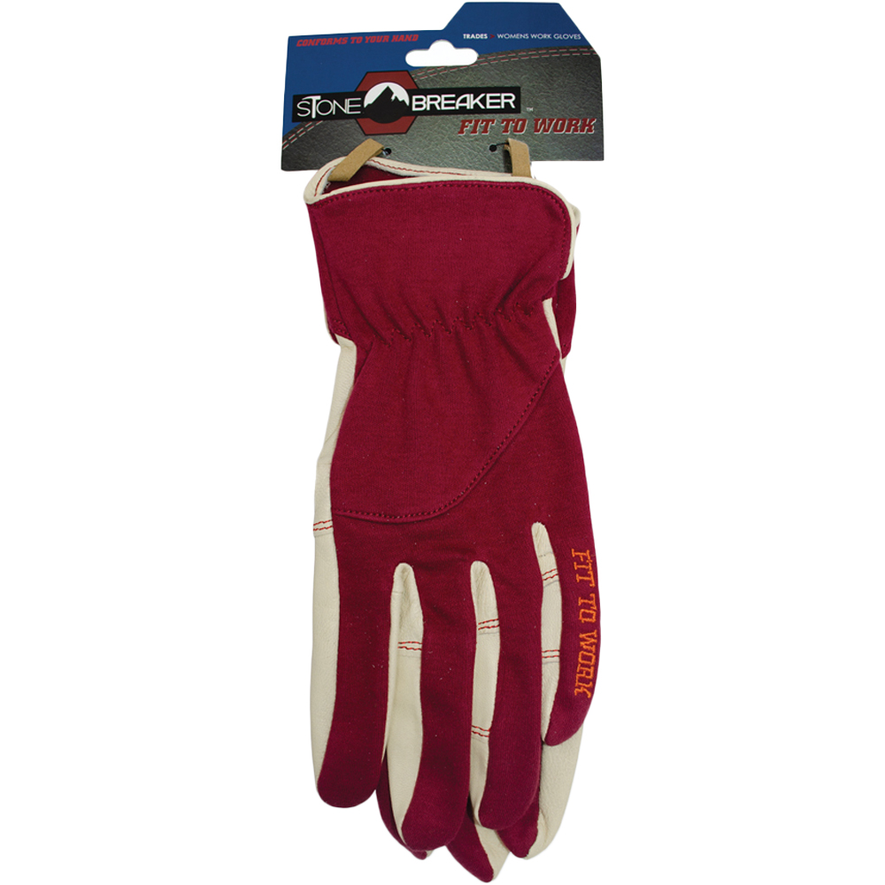 The StoneBreaker Burgundy Women's Work Gloves deliver long-lasting comfort and resilience for demanding tasks. Built on StoneBreaker's patent-pending 'Fit to Work' design, these large-sized gloves offer exceptional dexterity and a snug, secure fit, tailored specifically for hardworking hands. The premium goatskin palm, coupled with a breathable synthetic back, ensures all-weather comfort. Double-stitched seams and reinforced thread provide enhanced durability, making these gloves a dependable choice for any job, ensuring they last longer and protect better.
