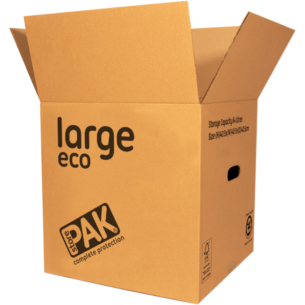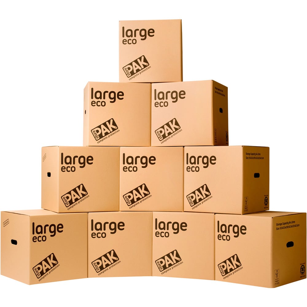 Keep your home neat and tidy with this pack of ten StorePAK Eco Large Storage Boxes. Perfect for moving or storing your possessions, these generously sized boxes offer a practical and eco-conscious storage solution. When full, these boxes can be stacked to maximise space, and when empty, they conveniently fold flat for compact storage. Designed with comfortable lifting in mind, each box features two integrated handles. Manufactured entirely from recycled materials, these cardboard boxes are also fully recyclable. Each box measures 40.5 x 40.5 x 40.5cm with a 64-litre capacity. This pack contains ten boxes.
