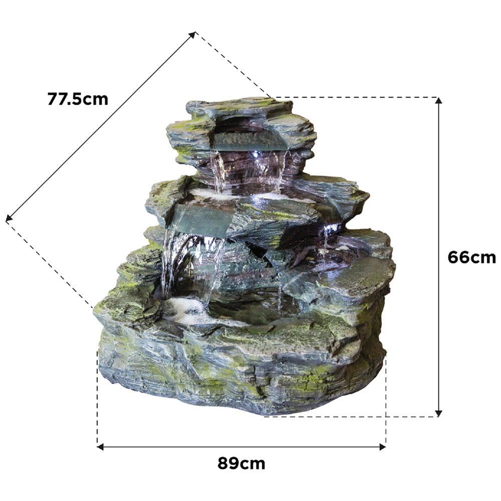 Escape to tranquility with the Garda Falls water feature. Its hand-painted, detailed finish, depicting realistically textured grey stone naturally covered in green moss and algae, seamlessly blends into any garden setting. Crafted from durable resin for lasting beauty, this self-contained water feature requires no connexion to your main water supply – simply fill it with water and plug it in. Enjoy the soothing sound of cascading water, beautifully illuminated by integrated LED lights, day or night. Suitable for indoor or outdoor use.