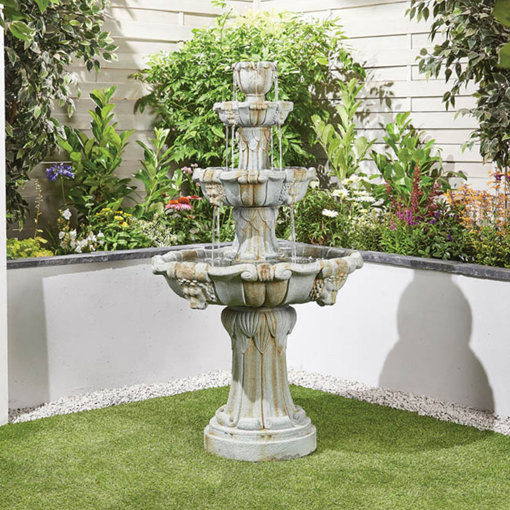 Elevate your outdoor space with the Lioness Fountain, a breathtaking four-tiered water feature. Its textured, stone-like finish and central stem, crafted from reinforced concrete, create a stunning focal point. Lion head details adorn each flower-shaped tier, adding a touch of classic elegance. The gentle cascade of water, recirculated via an internal pump, creates a soothing soundscape and sparkling visual spectacle. No external water supply is needed; simply plug it in and enjoy the tranquil atmosphere. This self-contained fountain brings grace and sophistication to any setting.