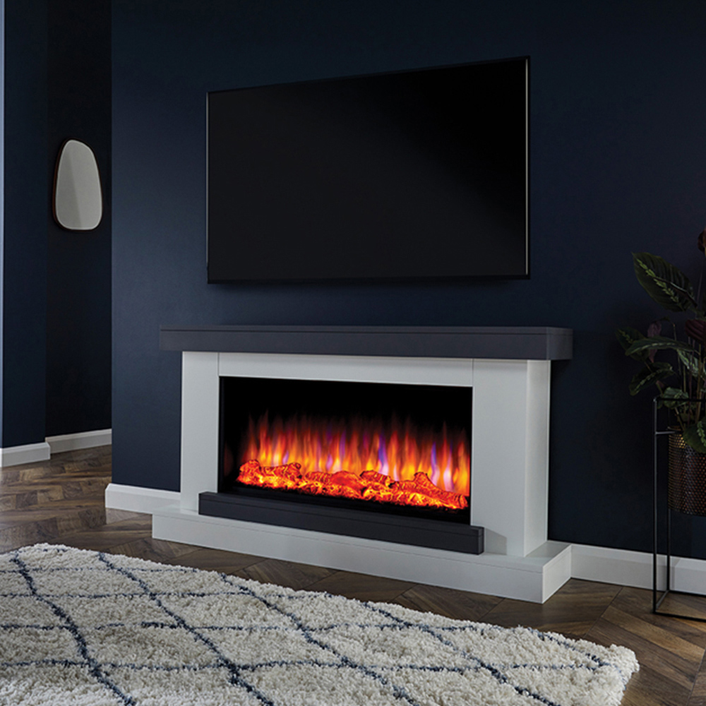Perfect for mounting a television above, Suncrest Colorado Textured White and Grey Electric Suite is a stylish, low-level electric fireplace with a widescreen flame effect. Its textured white and grey finish, with contrasting colours, makes this fireplace stand out. The energy-efficient LED flame effect, with three settings, creates a realistic flickering glow over the log bed, and 13 different ambient mood lighting colour settings give you even more control. For those who prefer the ambience without the heat, the flame effect can be used independently. The suite comes with a smart remote control, producing up to 2kW of heat, and features the latest EcoDesign energy-saving technology, including a 7-day programmable timer, draught detection, and adaptive start operation. This flat-to-wall fireplace requires no chimney breast, comes fully assembled, and is backed by a 1-year warranty.