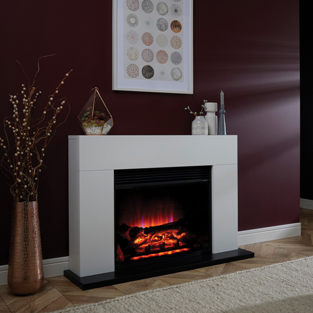 Add a dash of modern flair to your home with the Suncrest Lindale Textured White and Black Electric Suite. With its textured white finish against a contrasting black hearth, this fireplace boasts sleek, straight lines. The energy-efficient LED flame effect, with three settings, creates a realistic flickering glow over the log bed. The flame effect can be enjoyed without heat, and the suite comes with a smart remote control, producing up to 2kW of heat. It features the latest EcoDesign energy-saving technology, including a 7-day programmable timer, draught detection, and adaptive start operation. This flat-to-wall fireplace requires no chimney breast, comes fully assembled, and is backed by a 1-year warranty.