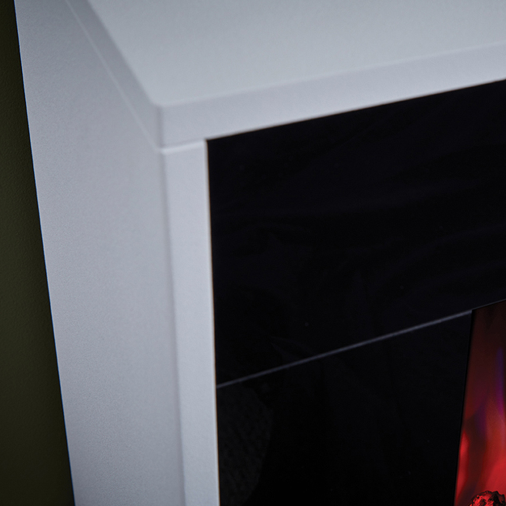 Elevate your living space with the Suncrest Nebraska Textured White and High Gloss Black Electric Suite. This stylish, modern, low-level electric fireplace is finished in textured white with a high gloss black front fascia, making it perfect for mounting a television above. Enjoy the ambience of flickering flames without the heat, thanks to the flame effect-only setting. The energy-efficient LED flame effect, with three flame settings, realistically flickers and glows, illuminating the log bed beneath. With 13 different ambient mood lighting colour settings, you have even more control over your room's atmosphere. Supplied with a smart remote control, this electric fire can produce up to 2kW of heat and features the latest EcoDesign energy-saving technology, including a 7-day programmable timer, draught detection, and adaptive start operation, ensuring it meets EcoDesign standards. This flat-to-wall fireplace requires no chimney breast, comes fully assembled, and is backed by a 1-year warranty, making it a convenient and stylish addition to any home.