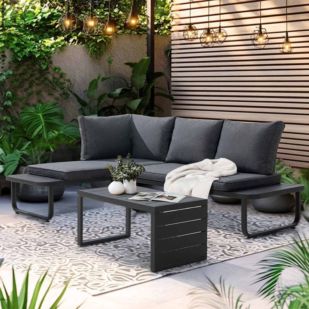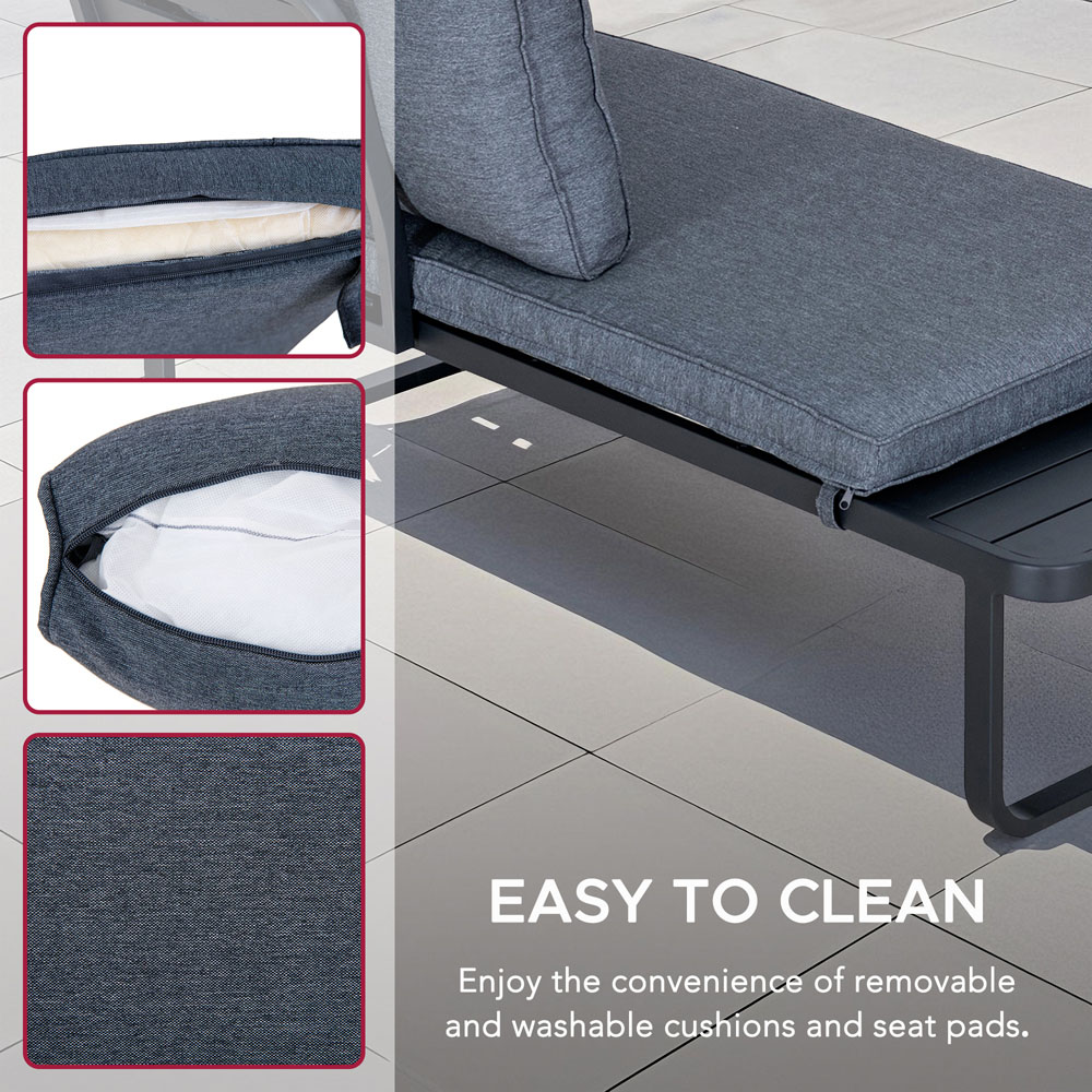 Enjoy ultimate comfort and style in your outdoor space with Sunjoy 4 Seater Grey L Shape Garden Lounge Set with Cushions. Whether you are enjoying a peaceful moment alone or hosting friends, this stylish and comfortable set is just what you need. With a strong black powder-coated aluminium frame, it’s built to last while keeping things modern and sleek. The soft grey cushions with polyester fabric covers make every seat extra cosy, and the elegant wood-look details on the table and sofa sides uplift the overall look. The set includes two spacious double-seat sofas and a matching coffee table, offering ample space to sit back and relax. The detachable backrest lets you adjust the seating to your liking, and the adjustable feet keep everything stable on any surface. Plus, the cushions are removable, making cleaning a breeze.