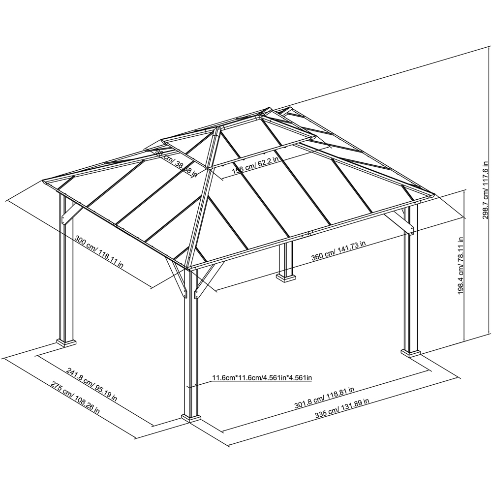 Expand your living space by bringing the indoors outside and create an end-of-the-day oasis that’s an ideal spot for entertaining family and friends. This 300cm x 360cm wood gazebo from the world’s leading ready-to-assemble outdoor structure maker, Sunjoy, creates the perfect outdoor setting for a gathering any time of the year. Spend all four seasons enjoying your covered area outdoors under a cedar wood frame gazebo with a sturdy powder-coated steel rooftop that will stand the test of time. The 2-tier roof provides just the right amount of airflow while simultaneously keeping occasional inclement weather at bay. Set the mood by suspending a chandelier from the incorporated ceiling hook for functional light and a touch of elegant design. With straightforward, easy-to-follow assembly instructions you’ll soon be relaxing in your favourite new outdoor living space, and for years to come.