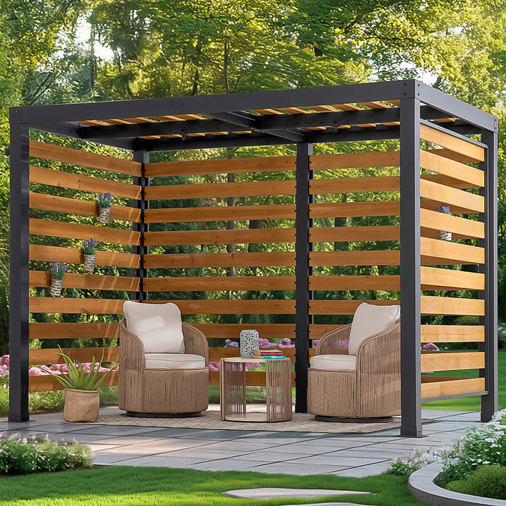 Transform your garden into a serene outdoor retreat with the Sunjoy Marao Black and Brown Steel Pergola 1.91 x 3.13m. This modern-style pergola boasts a durable, rust-resistant steel frame complemented by a beautiful cedar screen. With straightforward assembly instructions included, you can quickly set up your new favourite outdoor living space and start enjoying it in no time.