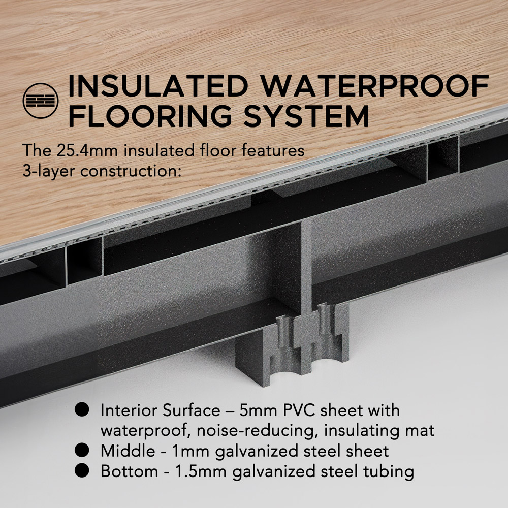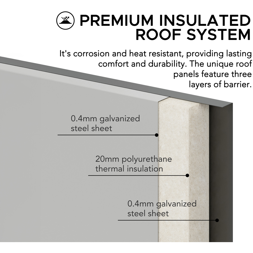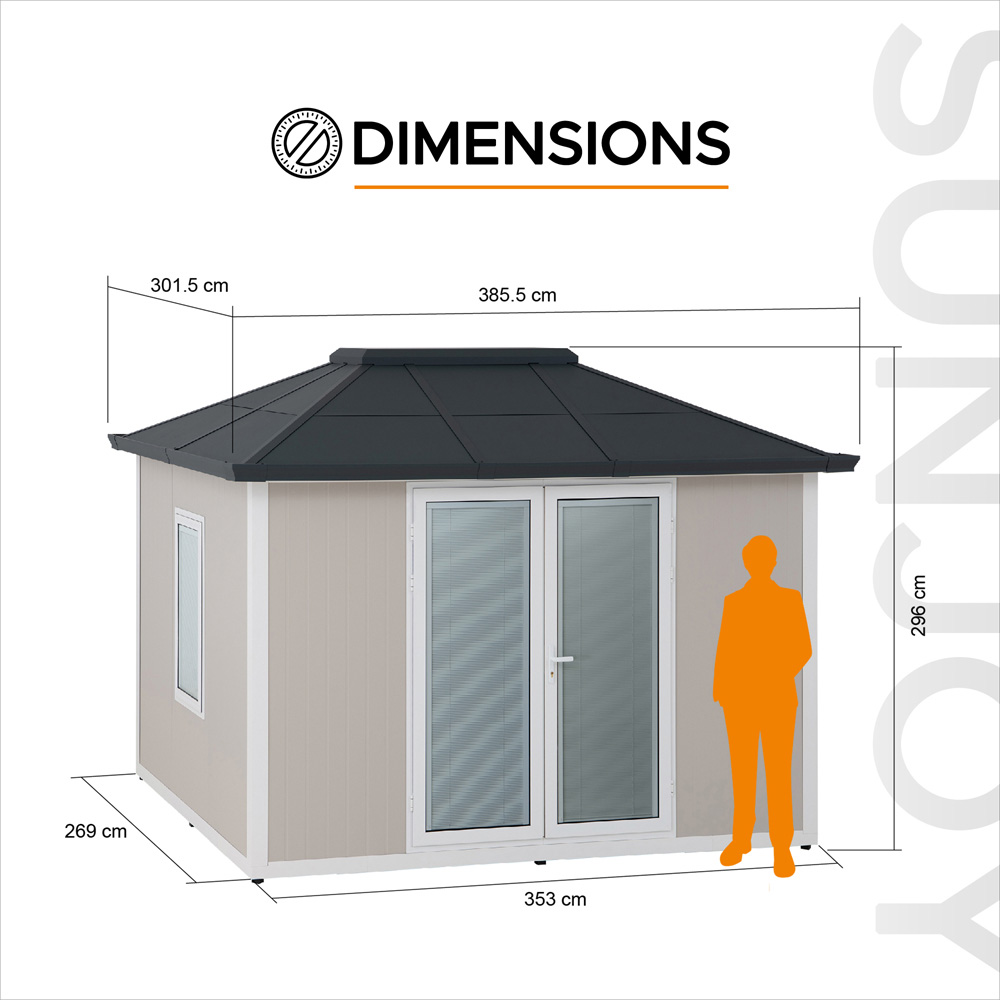 Welcome to a world of timeless elegance and enduring quality – your sanctuary awaits. Transform your backyard into a space of limitless possibilities with the Esquire Beyond Shed from Sunjoy. This innovative and customizable outdoor room is designed to expand the functional space of your home and garden. Whether you're looking for a garden shed, backyard office, 'she' shed, home fitness studio, or a multipurpose space, the Beyond Shed has got you covered. Crafted with meticulous attention to detail, this generous 385.5 x 301.5cm shed features superior craftsmanship and durability. With insulated walls, doors, windows, roof, and floor, you'll experience comfort and the peace of mind that comes with quality construction year-round. The modular and interchangeable wall and window panels offer maximum flexibility and customization, while the premium insulated roof system provides exceptional moisture protection and thermal resistance. Assembly is a breeze with the innovative modular panel design and fully panelised wall sections. Take control of your outdoor space and make it your own with the Esquire Beyond Shed! Exquisite Craftsmanship: 353 x 269cm.