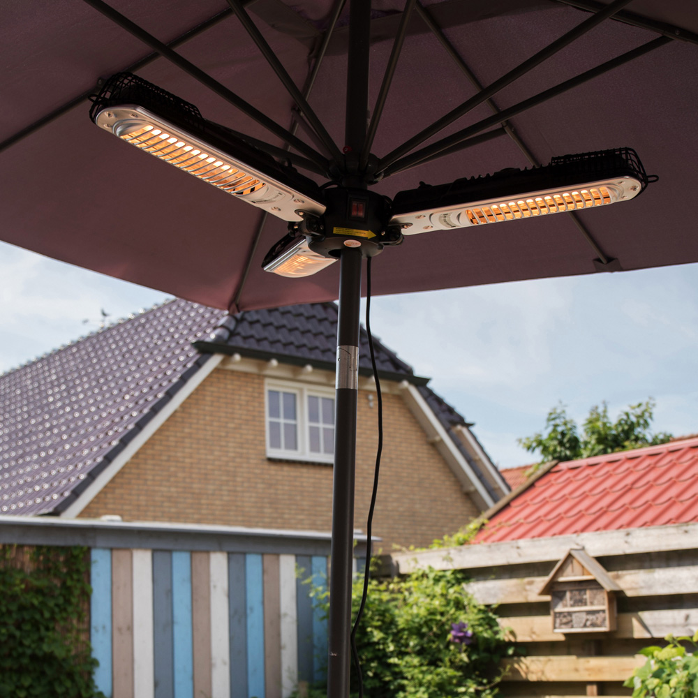 Stay warm outdoors longer with this electric patio heater, perfect for open terraces. Three infrared heating elements provide quick, consistent warmth unaffected by wind. With three heat settings (650W, 1300W, and 2000W), you'll feel the heat in just 5 seconds. Easy to mount, it fits parasol poles from 25mm to 60mm in diameter. Enjoy cosy evenings even after sunset.