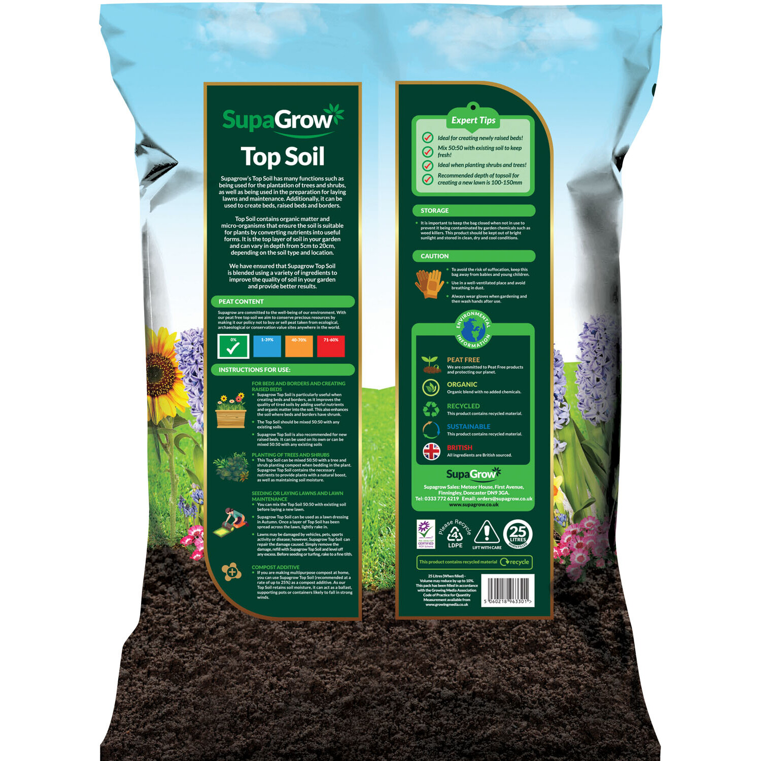 Boost your garden',s health with SupaGrow Premium Blended Top Soil. This lightweight, peat-free, and 100% organic soil is perfect for all your landscaping needs, from beds to borders. Its unique blend promotes strong root growth, retains moisture, and improves soil fertility, ensuring thriving plants.