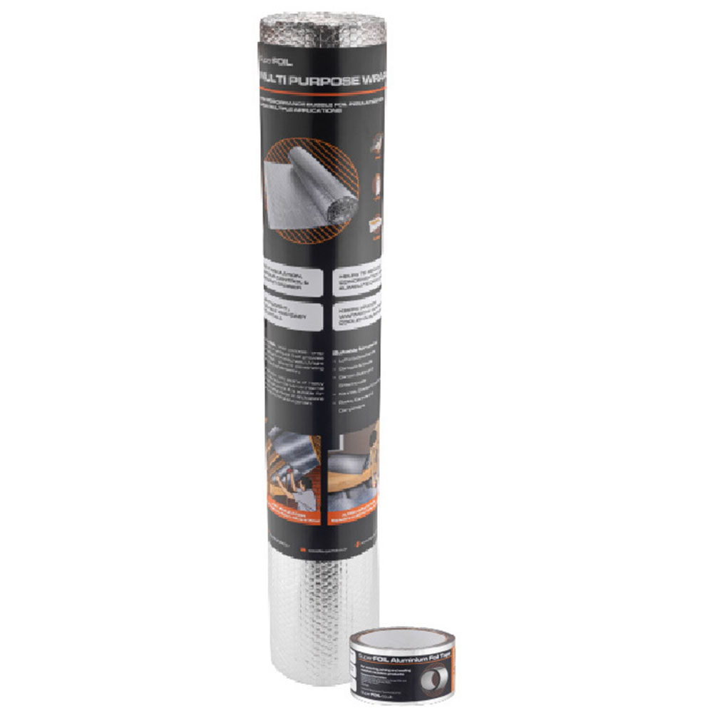 Boost your home's energy efficiency with the SuperFOIL Multipurpose Insulation 1 x 7m and Foil Tape Set. This 3-in-1 system acts as a vapour barrier, radiant heat reflector, and insulator, shielding against cold, heat, and UV rays. Its heavy-duty, reflective foil layers with a bubble structure create a powerful barrier against drafts, dampness, and condensation. Suitable for diverse applications around your home and garden, including lofts, basements, garages, and sheds. The included aluminium foil tape ensures a secure, lasting installation.