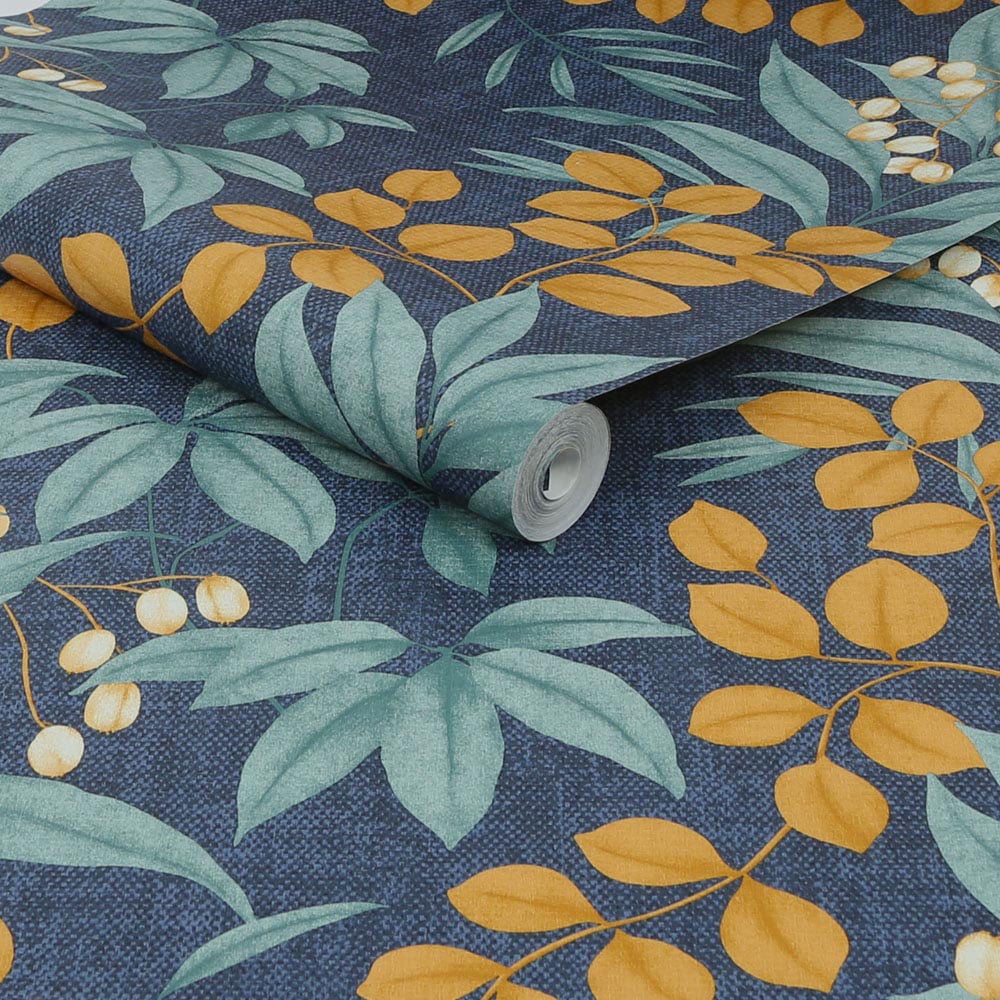 Transform your space with the Superfresco Easy Persephone Navy and Ochre Wallpaper. This design is perfect for adding a touch of sophisticated colour to any room. Featuring intertwining leaves against a textured background, it creates a flawless look. Roll size: 10m.