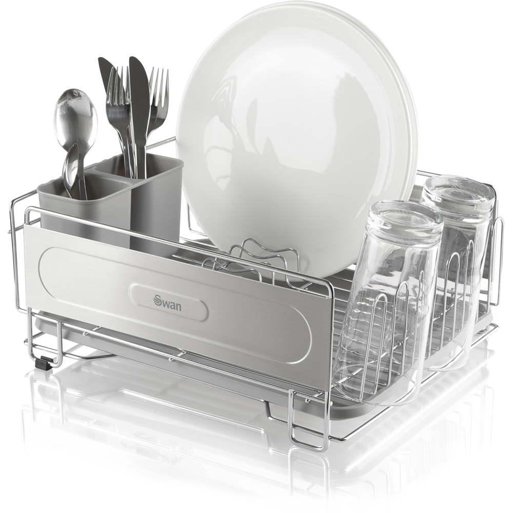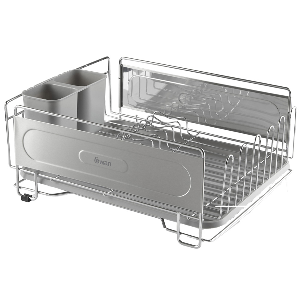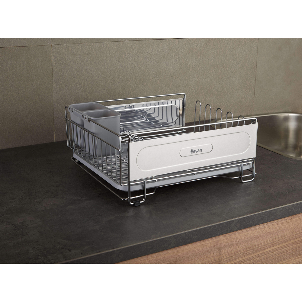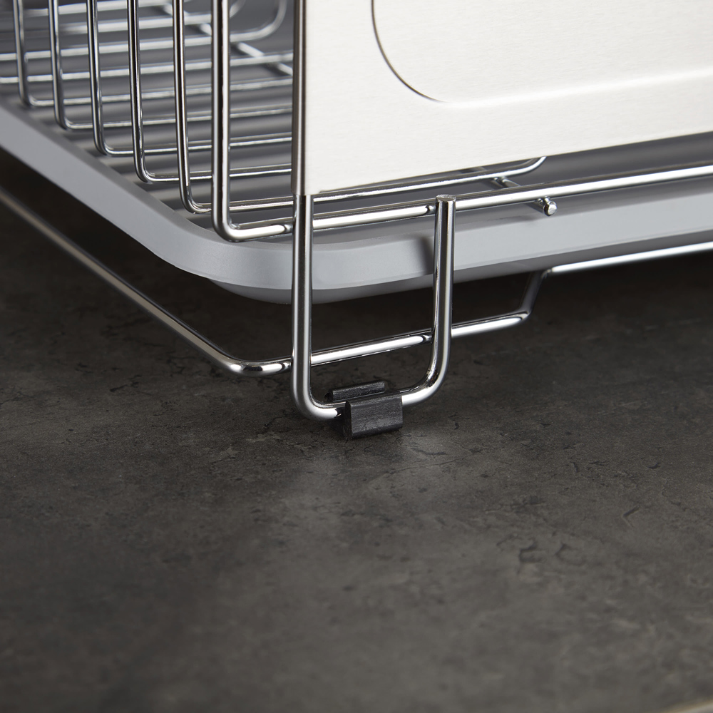Keep your kitchen surfaces clutter-free with this stylish chrome dish rack. Its convenient design provides ample space for drying dishes, and includes two detachable utensil holders for organised cutlery storage. Designed for stability, the durable chrome wire construction features anti-slip feet, ensuring a secure fit on your countertop or draining board.