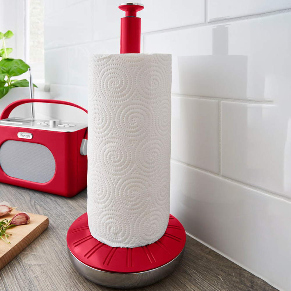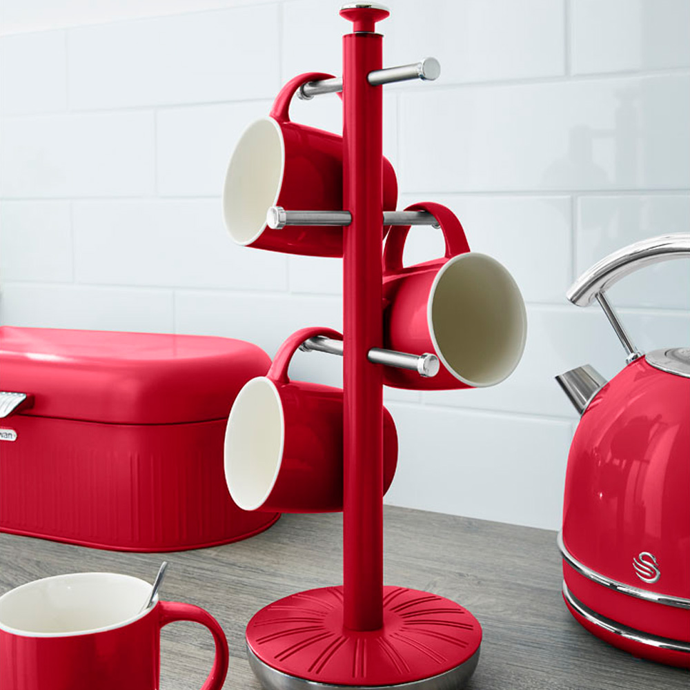 A stylish and practical kitchen organiser, this Swan Retro Red towel pole and mug set adds a touch of vintage charm while keeping your workspace clutter-free. Its durable construction and non-slip bases provide secure storage for up to six mugs, preventing accidental damage. The matching towel pole, with its sturdy stainless steel base, accommodates kitchen roll of any size, offering effortless one-handed dispensing. The set',s distinctive retro design, featuring vertical stripes and chrome accents, makes a superb addition to any kitchen.