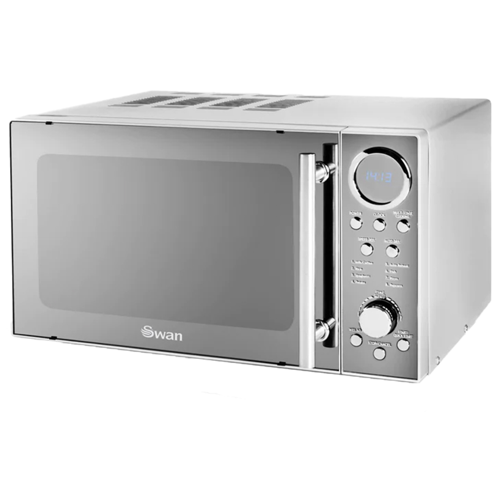 Effortlessly cook delicious meals with the Swan Silver Digital Microwave. This 20L microwave boasts a sleek white finish, complementing any kitchen style. Its powerful 800W performance ensures quick and efficient cooking. Convenient features include multi-stage cooking, speed defrost, auto-defrost, and a range of pre-set options for added ease. A digital clock and power settings complete this practical appliance.