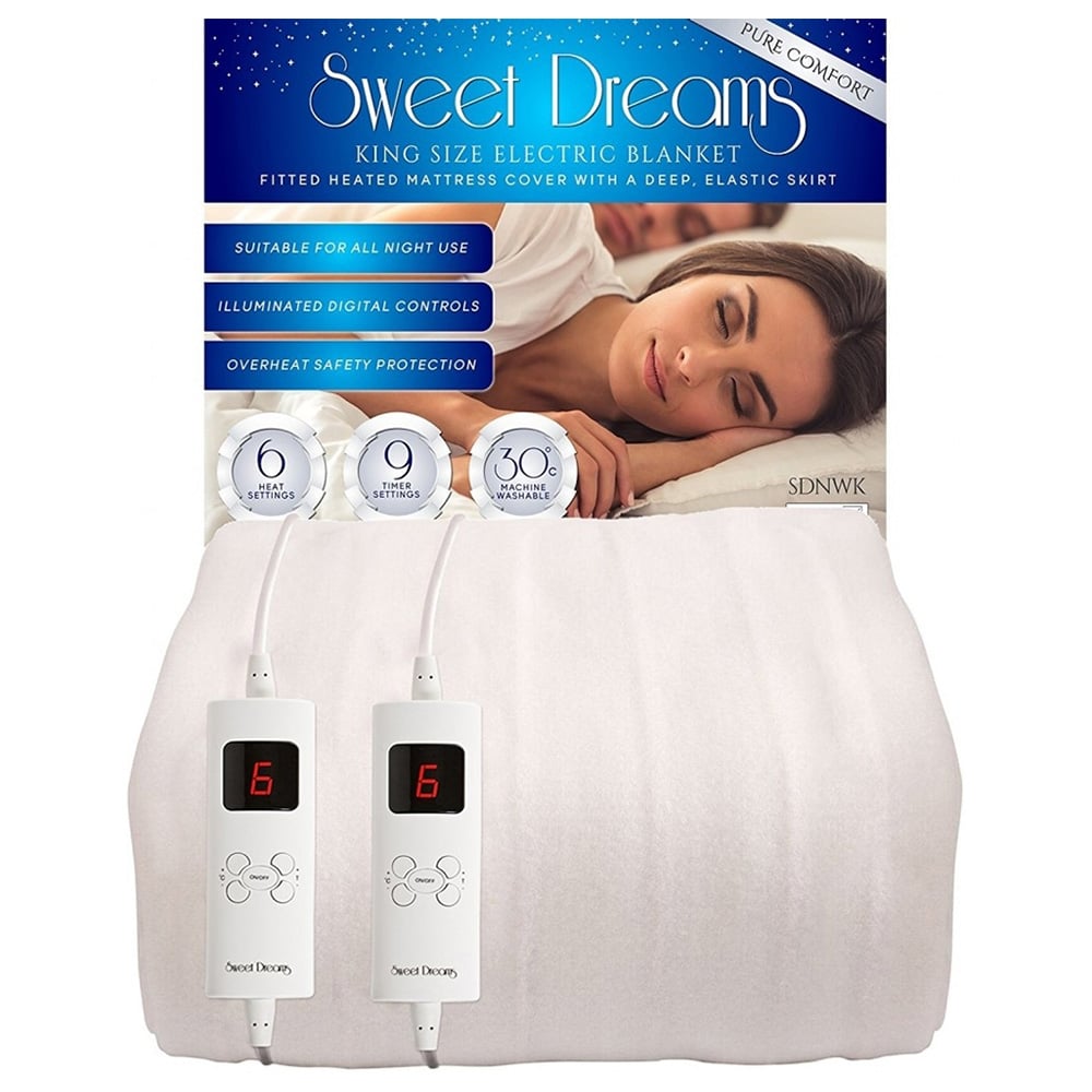 Indulge in a blissful night's sleep with the Sweet Dreams King Fitted Electric Blanket. Crafted from premium materials for exceptional durability and comfort, this blanket ensures a cosy embrace throughout the seasons. Enjoy the ultimate in relaxation with its ultra-thin, discreet heating wires and a deep, elasticated skirt that conforms snugly to your mattress. Experience customized warmth with six heat settings and nine timer options, allowing you to tailor the temperature to your ideal comfort level. Safeguarding your well-being, this blanket features built-in overheat protection and automatic shutoff, ensuring peace of mind for all-night use. Simple care is a breeze, simply detach the removable controller and machine wash at 30°C. Compact storage is provided with a convenient zip-up carrying bag, perfect for convenient storage during warmer months. Size: 203 x 152cm.