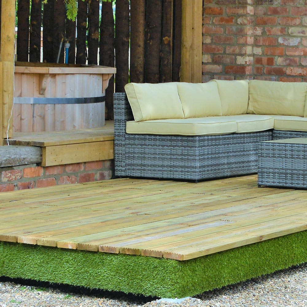 Build your dream deck with this all-inclusive kit. It features height-adjustable pre-cast concrete foundations, a frame of pre-cut, treated timber beams with pre-hung joist hangers, and 32mm thick decking boards—all pre-cut to size. All fixings are included, and assembly is straightforward using only basic hand tools. Plus, you',ll receive high-quality artificial fascia grass and a weed-resistant membrane to keep your deck looking its best. The kit covers a 4.75m x 4.7m area.