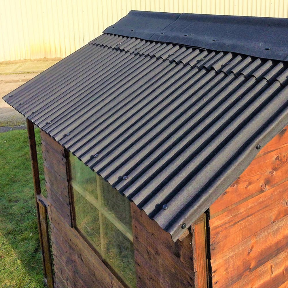Quickly and easily re-roof your shed, summerhouse, workshop, garage, playhouse, log cabin, lodge, bike store, shelter, beach hut, or log store with our complete Watershed Roofing Kit. This kit includes everything you need: pre-cut corrugated bituminous roofing tiles (3mm thick), ridge tiles, timber battens, screws, and screw caps, plus clear instructions. The tiles' classic corrugated design ensures a simple yet highly effective watertight seal, channelling rainwater away from your building. Suitable for pent or apex roofs with a 10-degree or greater pitch. Covers a 10ft x 10ft area.