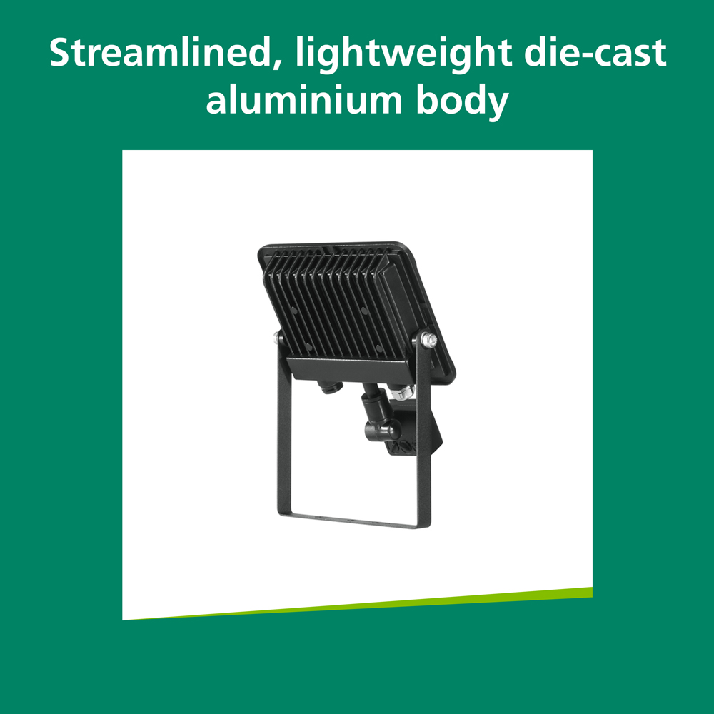 Enhance your home's security and brighten outdoor areas with the Sylvania SylFlood 43W Black Outdoor LED Floodlight. This slimline, IP65-rated floodlight is an ideal choice for gardens, driveways, and building exteriors, combining a sleek aesthetic with robust weather resistance. Equipped with a PIR motion sensor, it effectively deters unwanted visitors by detecting movement in darkness and instantly activating the light.