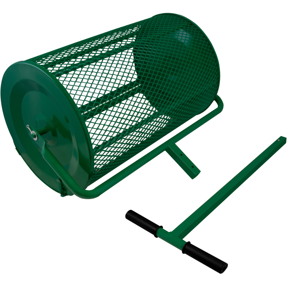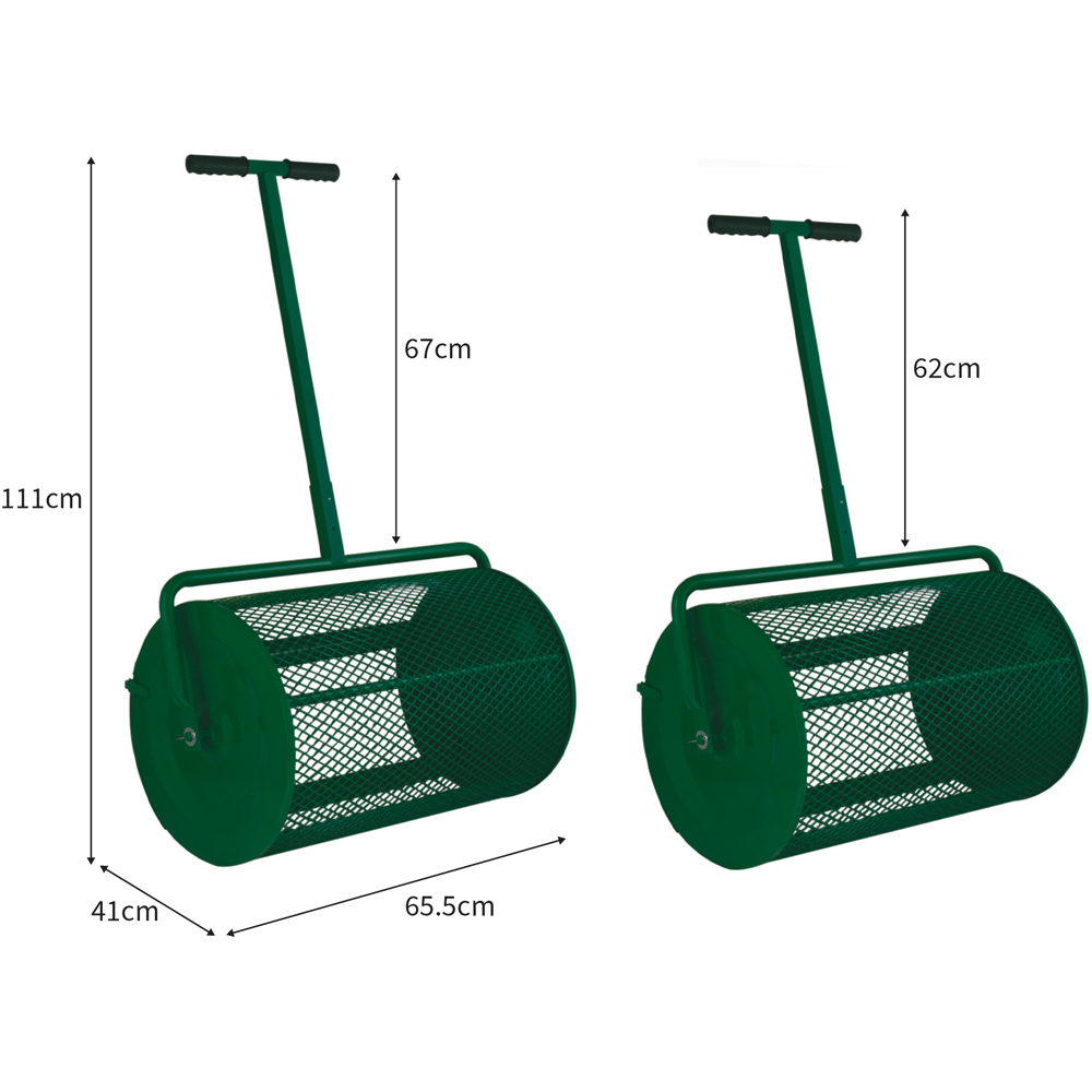 Give your lawn the nutrients it craves with this efficient 80L compost spreader. Perfect for a variety of fine materials including compost, peat moss, topsoil, seeds, and manure, this spreader ensures even distribution across your lawn. Quick and easy assembly – simply attach the included handle, fill the drum, and roll! The rotating drum evenly spreads your chosen material, saving you both time and effort. The generous 80L capacity provides superior coverage. Smart diamond-shaped slits (1/2 x 3/4 inch) ensure a consistent flow for flawless results. The 2.5mm thick mesh barrel features a hinged swing door with secure locking clasps for easy filling and safe use. Adjust the pole length (24.4 and 26.4 inches) for comfortable use, and appreciate the ergonomic, non-slip T-shaped handle. A pair of gardening gloves is also included. Constructed from durable, yet lightweight 10-gauge steel with a powder-coated green finish, this spreader is weather-resistant and stylish. Effortlessly manoeuvre it around your garden to ensure your plants receive the nutrients they need to thrive, while also filling in any imperfections in your lawn.