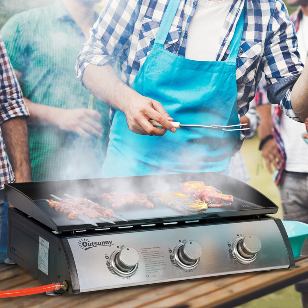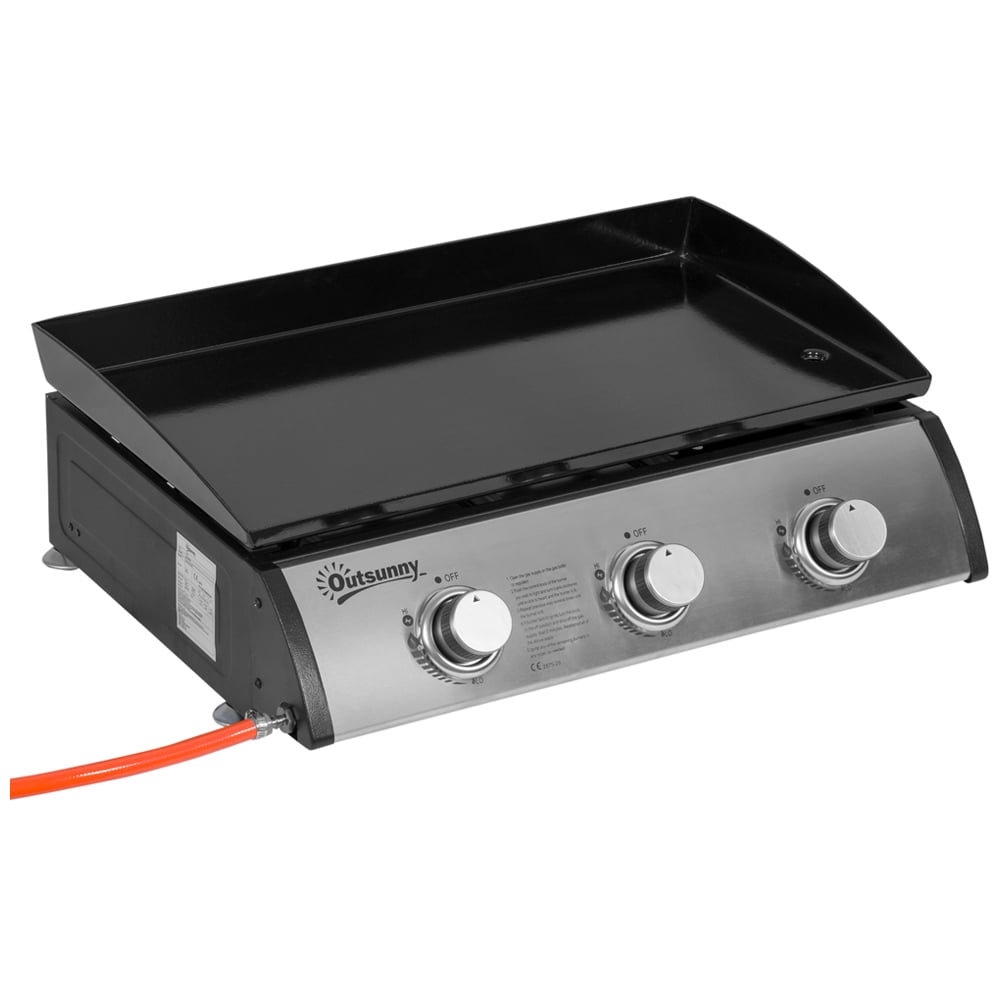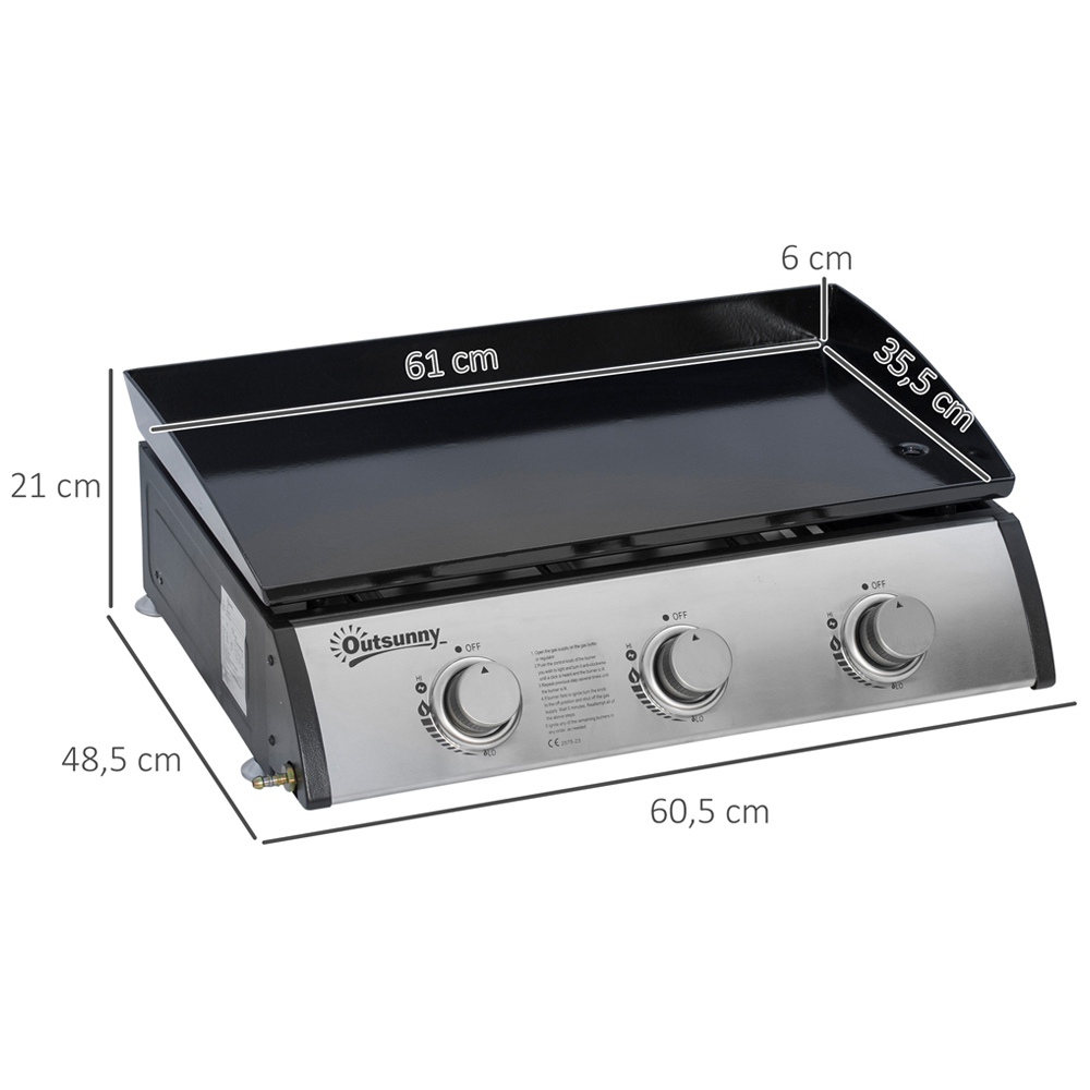 Enjoy cooking anywhere and anytime with this Outsunny Black and Silver 3-Burner Gas Tabletop Plancha Grill. This device is perfect for those times when you want your own hot food. With a three-burner design, the unit gives you three individual cooking areas for preparing a variety of meals. Also, each burner has 3 kW of power to ensure simple and efficient cooking. Easy to clean, the non-stick plate makes it simple to prepare your favourite dishes and wash them. The device comes complete with a grease-collection box and 2cm of adjustable feet. Size: 60.5 x 48.5 x 21cm. Keep your BBQ covered and protected with our range of premium BBQ covers.