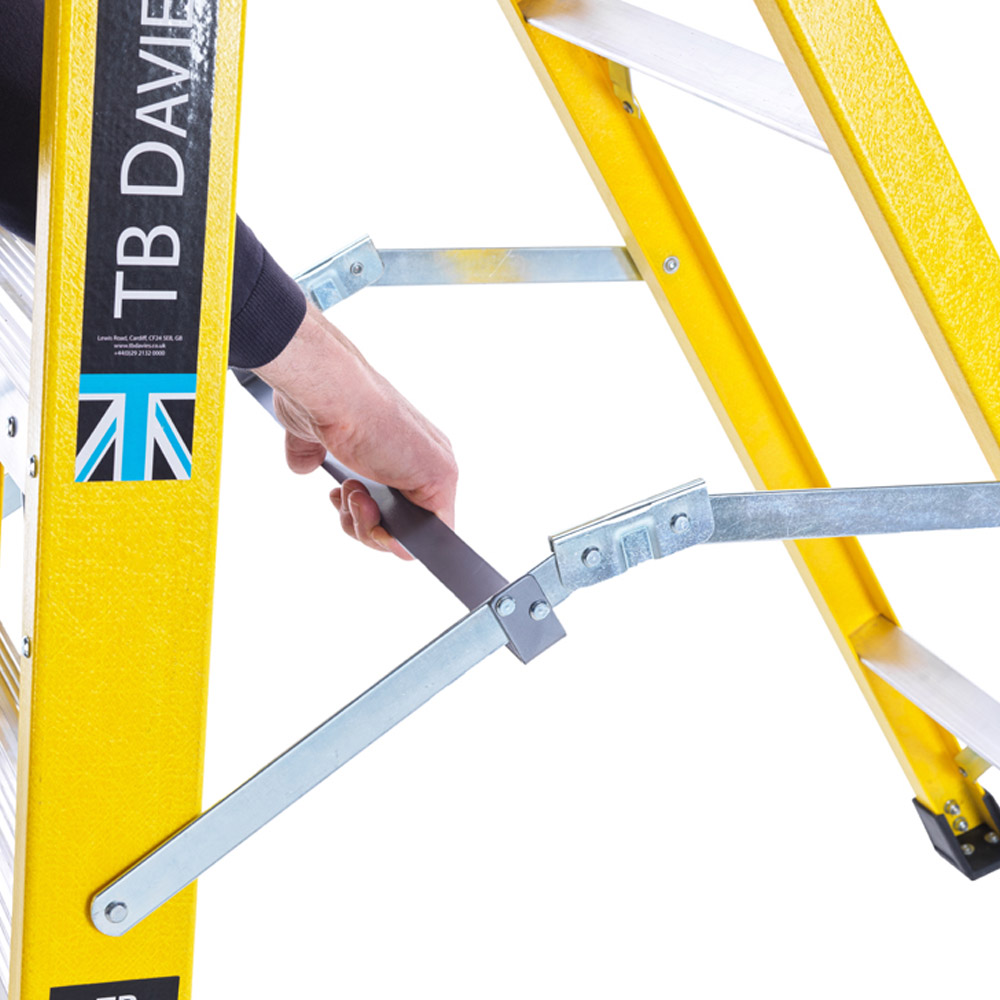 The TB Davies 8 Tread GRP Step Ladder is expertly crafted from robust, non-conductive fibreglass, ensuring safety and reliability when working around electrical environments. Insulated to 30,000 volts, this ladder is ideal for both home and workplace tasks. Designed with a multi-functional tool tray, it enhances productivity by keeping essential tools within easy reach, minimizing the need for unnecessary trips up and down. Its lightweight construction, featuring super-strong C-section fibreglass stiles and reinforced aluminium 80mm treads, provides durability without compromising ease of handling. Ideal for the busy tradesman, this ladder is a smart choice for a variety of tasks. For Professional Use. This item is delivered direct to you from one of our suppliers, please see our Terms & Conditions for details.