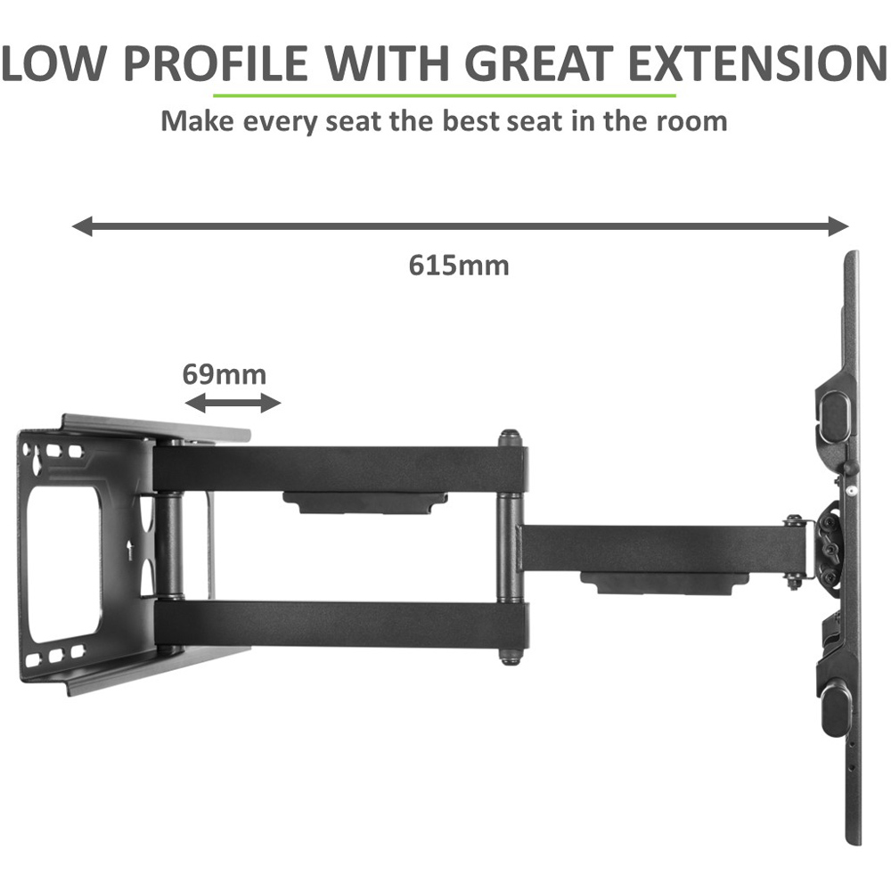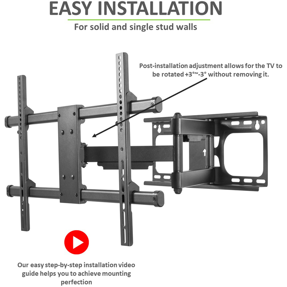 Maximize your viewing experience with the Multi-Position Double Arm TV Wall Mount. This space-saving solution securely mounts 37" to 80" TVs (up to 60kg). Enjoy unobstructed views with up to 61.5cm of extension, 180° swivel, and a 5° to -15° tilt. Fine-tune alignment with an additional 3° of clockwise and counter-clockwise adjustment. The integrated cable management system keeps things tidy. Installation is straightforward with included fittings and instructions for solid and single stud walls. Compatible with VESA patterns of 200x200, 400x200, 300x300, 400x400, and 600x400mm. Backed by a lifetime warranty.