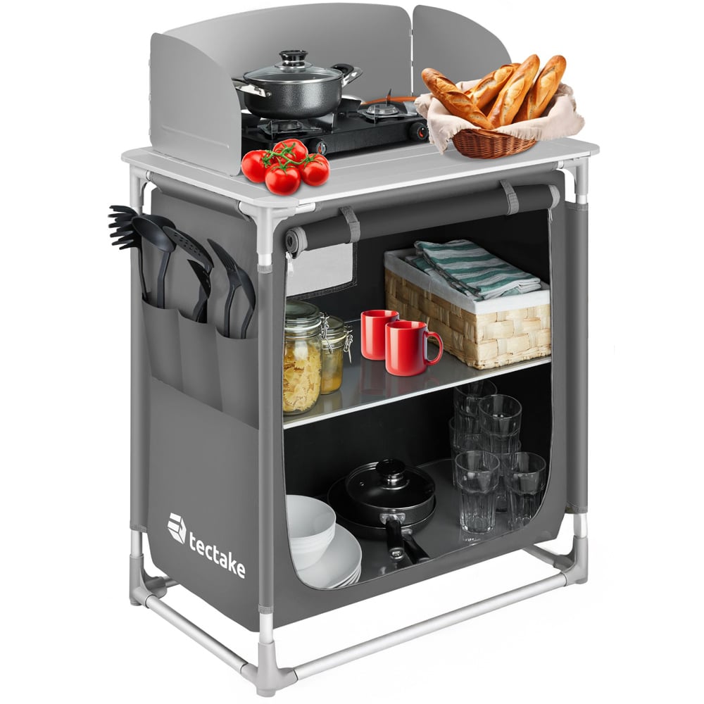 This tectake camping kitchen offers a winning combination of portability and practicality for outdoor cooking adventures. Despite its compact design, this robust kitchenette provides ample storage and a stable work surface. Sheltered by the windbreak, you can prepare meals almost as easily as at home, while the heat-resistant worktop provides a safe and convenient space for meal preparation. The spacious storage compartment features two levels and a mesh back for ventilation, ideal for keeping cooking equipment and supplies organised. An external pocket keeps cutlery and other essentials close to hand. Height-adjustable feet ensure a level surface, even on uneven ground, allowing the camping kitchen to adjust to suit the terrain. When the trip is over, the kitchen folds down quickly and easily into the included carry bag for effortless transport and storage. Lightweight and compact, this tectake camping kitchen is an essential companion for any outdoor enthusiast.