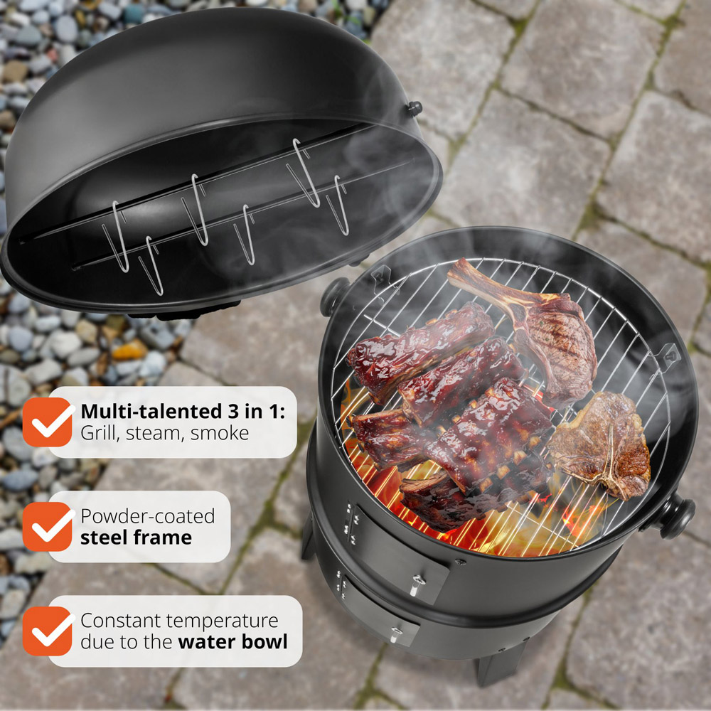 Elevate your outdoor cooking with tectake's versatile 3-in-1 BBQ smoker. More than just a grill, this classic smoker lets you smoke, grill, and barbecue using wood or charcoal for maximum flavour. With three tiers, you can easily grill, cook, and smoke food to your desired temperature. The two 37 cm diameter grills provide ample space for cooking for family, friends, or neighbours. The built-in lid thermometer displays the internal temperature, which is easily adjusted using the side and lid vents. An integrated water tray helps maintain a consistent low temperature for perfect smoking or steaming vegetables. Quick to assemble and easy to use, this BBQ promises hours of outdoor barbecue fun.