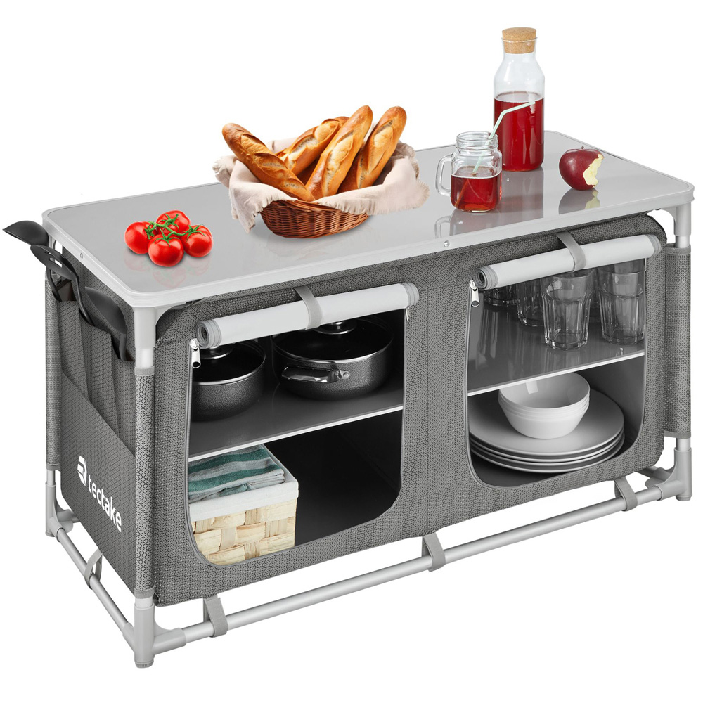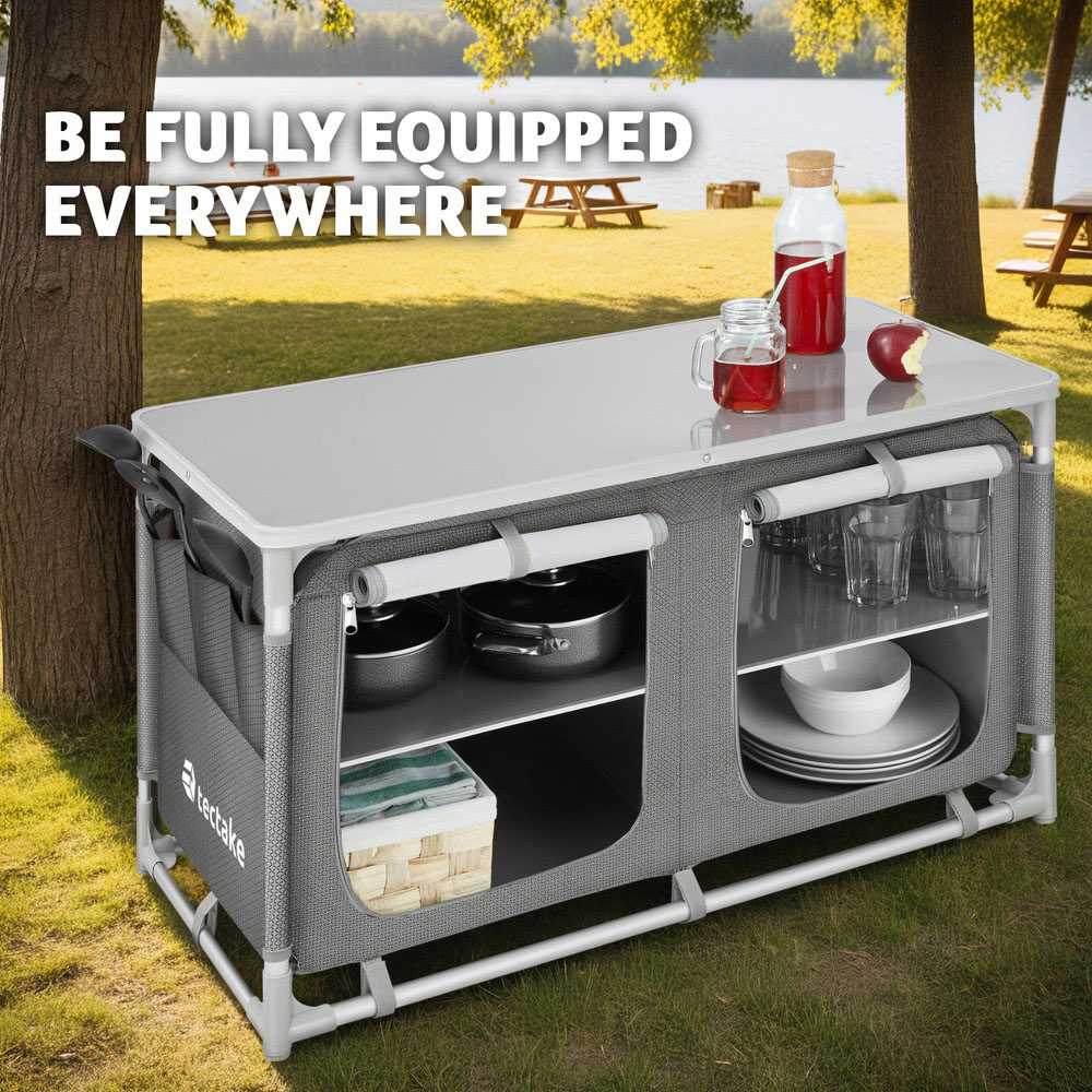 Looking for a camping kitchen that's a space-saving marvel? This stable unit from tectake offers a generous worktop and four storage compartments with aluminium-reinforced interior boards and ventilating mesh, perfect for stashing away all your kitchen essentials. The aluminium-reinforced interior boards and ventilating mesh in the compartments ensure your items stay fresh and organised. Smaller bits and bobs, like cutlery and accessories, can be neatly stored in the three-part outer pocket.