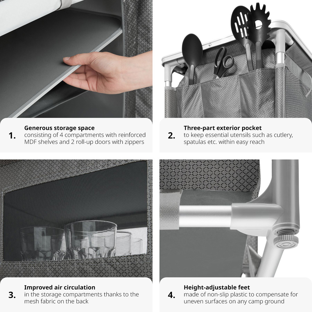 Uneven ground? No problem! The four independently adjustable feet keep the work surface perfectly level, and the smooth worktop doubles as a breakfast bar. Easy to assemble and extremely compact when folded, this collapsible kitchen is ideal for any outdoor adventure. It'll quickly become an indispensable part of your camping setup, almost as essential as the tent itself.