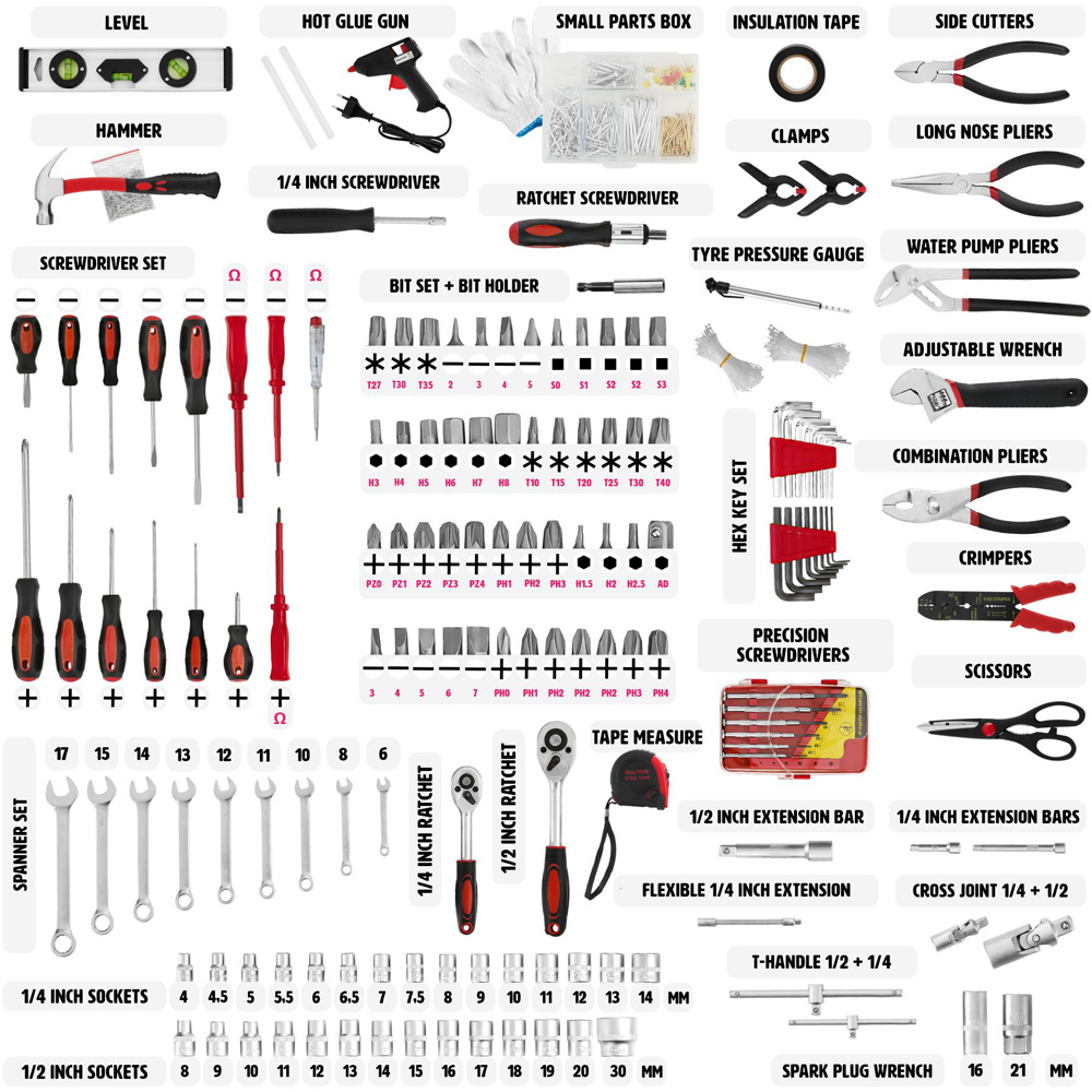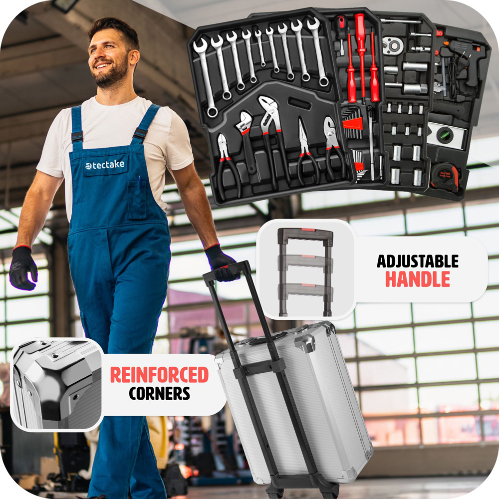 The tectake 599-Piece Tool Box Trolley is a must-have for any home, garage, or workshop. This robust trolley boasts four levels, each meticulously organised with a comprehensive selection of tools and accessories. From screwdrivers to ring spanners, pliers to a hot glue gun, you'll find everything you need neatly in place. Ergonomic handles ensure a secure grip and precise handling, while the fitted grooves on each level keep tools secure and maximise space efficiency. The aluminium-reinforced trolley provides exceptional security for your tools. Effortless transportation is guaranteed thanks to the smooth-rolling wheels and telescopic handle. A true space-saver, this compact design houses a multitude of tools, making it ideal for both DIY enthusiasts and professional tradespeople. With this well-organised tectake toolbox, you'll always have the right tool at your fingertips, ready for any task.