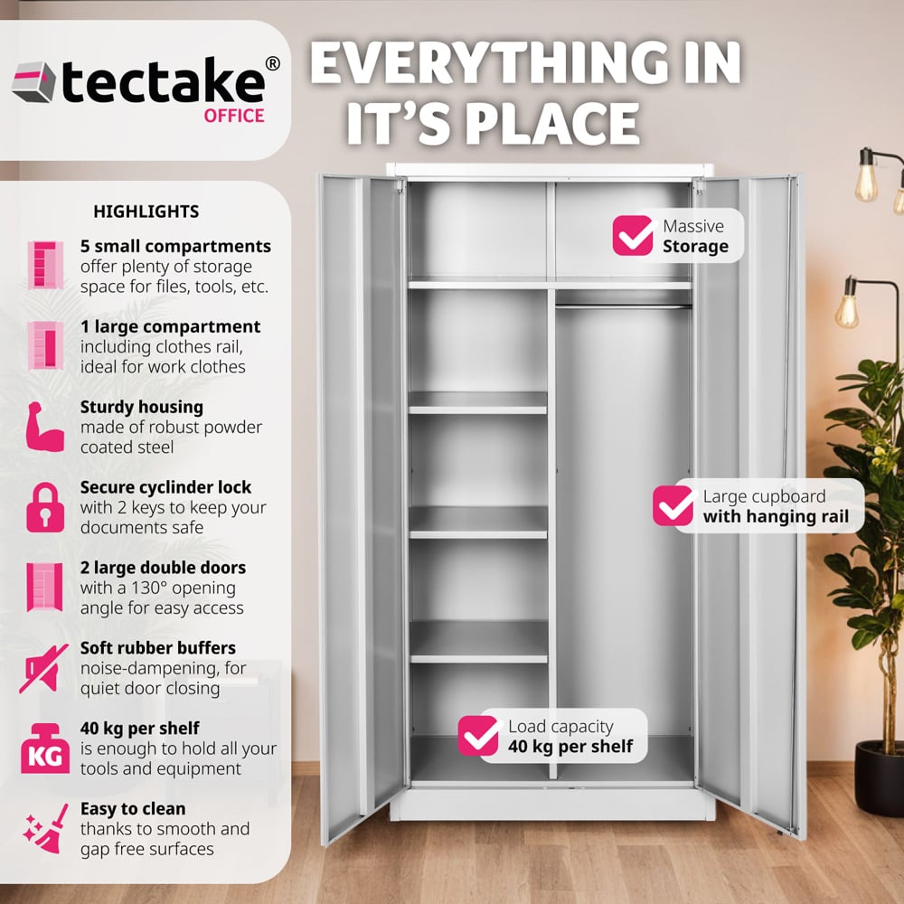 Maximise your storage potential with the Tectake Filing Cabinet, finished in a sleek grey powder coating. A great solution for home offices, this cabinet features six shelves and a rail, perfect for organised document storage. Constructed from robust, high-quality steel, it offers both durability and a smart aesthetic. The reinforced swing doors, complete with noise-dampening rubber buffers, open to a generous 130 degrees for easy, quiet access. Security is paramount thanks to the turning handle and security cylinder lock, supplied with two keys to keep your files safe. Simple self-assembly is required, resulting in a cabinet with dimensions of 180 x 80 x 40cm, ideally sized for a variety of environments.
